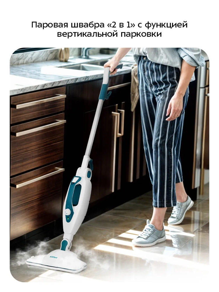 Паровая швабра Kitfort КТ-1080 — универсальное устройство, которое поможет избавиться от пыли и грязи с помощью мощной струи пара, а также продезинфицирует обрабатываемую поверхность. Паровая швабра очистит раковину и плиту на кухне, зеркала и мебель без каких-либо химических средств, исключительно паром.