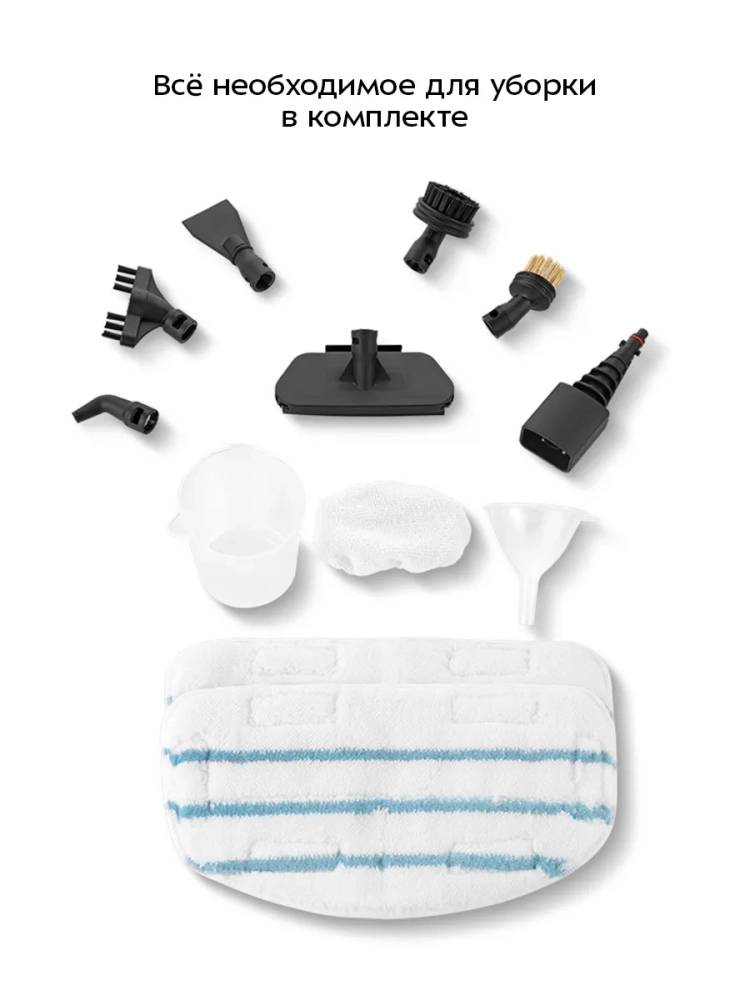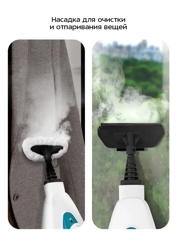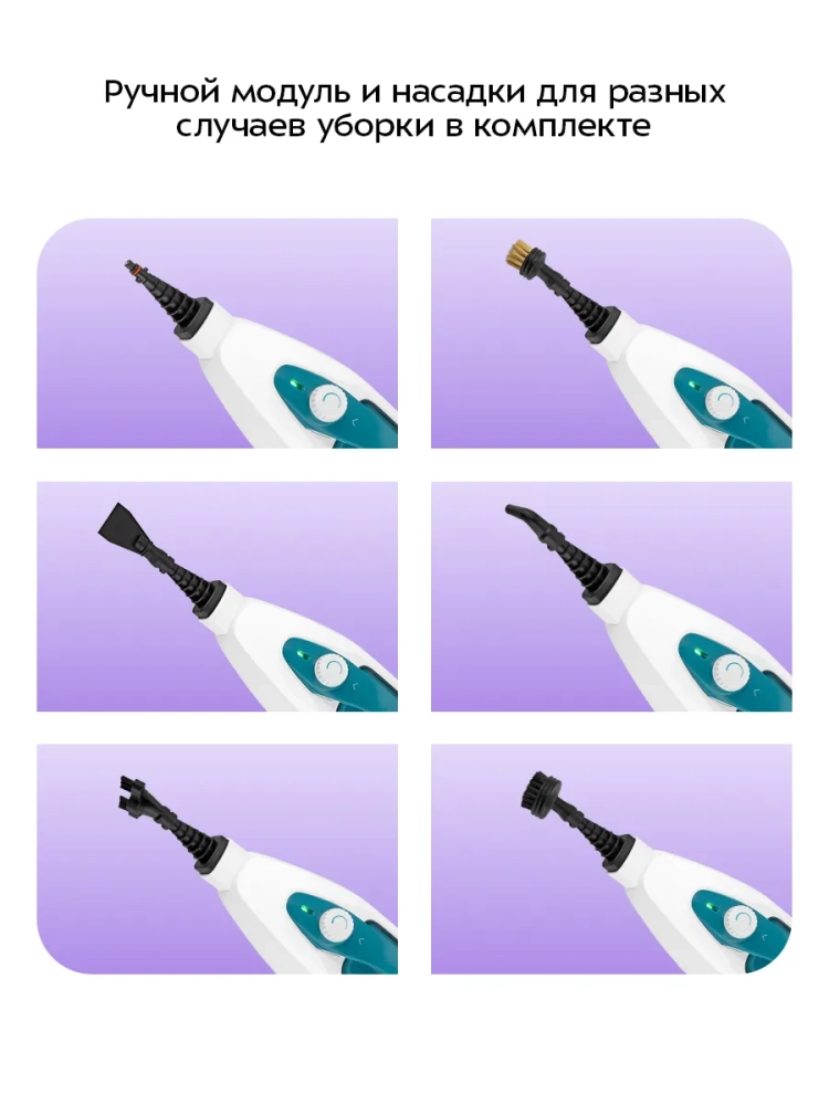 Конструкция «2 в 1» предусматривает наличие ручного модуля, который удобно использовать с насадками. С помощью насадок можно очистить большинство вещей в доме: легко отмыть окна, почистить шторы и мягкую мебель. Скребок, латунная и нейлоновые щетки эффективно очищают сложные загрязнения с помощью механического воздействия. В комплекте есть насадка для отпаривания с тряпкой для отпаривания, чтобы отпаривать одежду и чистить обивку мягкой мебели. На насадке для отпаривания предусмотрен резиновый скребок для очистки окон, зеркал и кафельной плитки. Струйная и угловая насадки помогут очистить щели и углы.