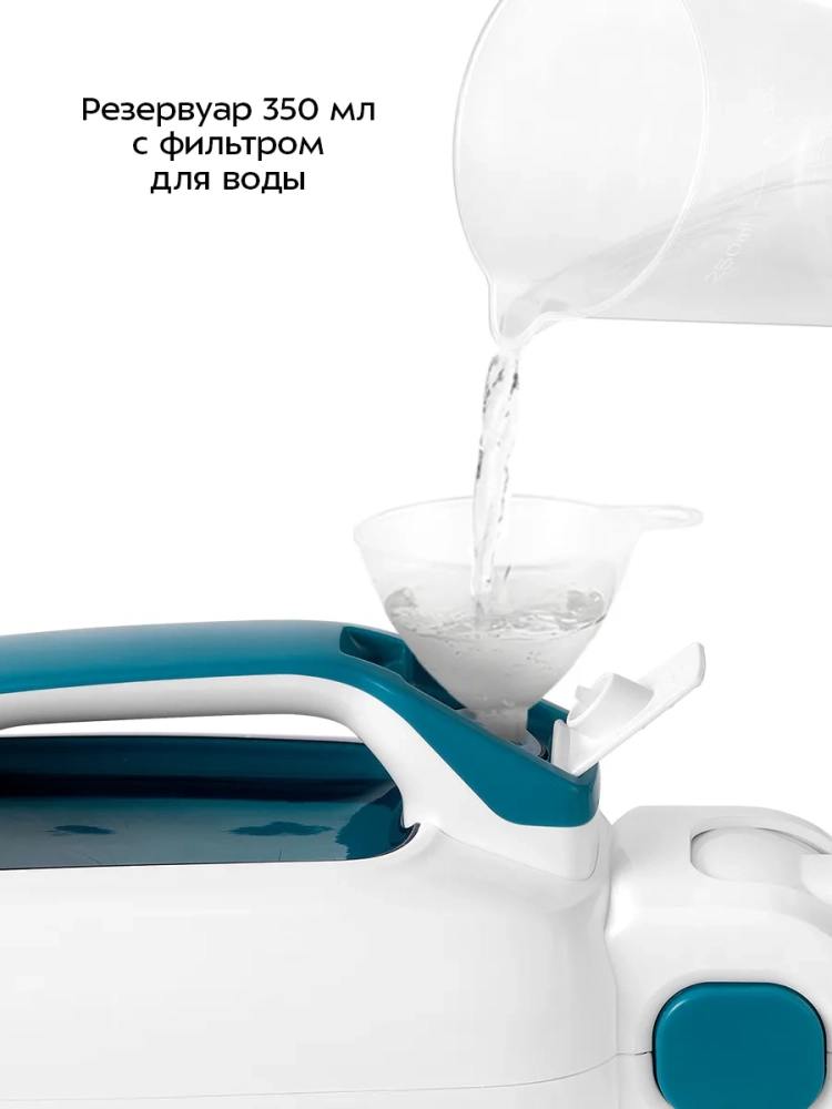 Устройство оснащено съемным резервуаром для воды емкостью 350 мл, что позволяет производить непрерывную уборку от 10 до 14 минут в зависимости от интенсивности подачи пара.
