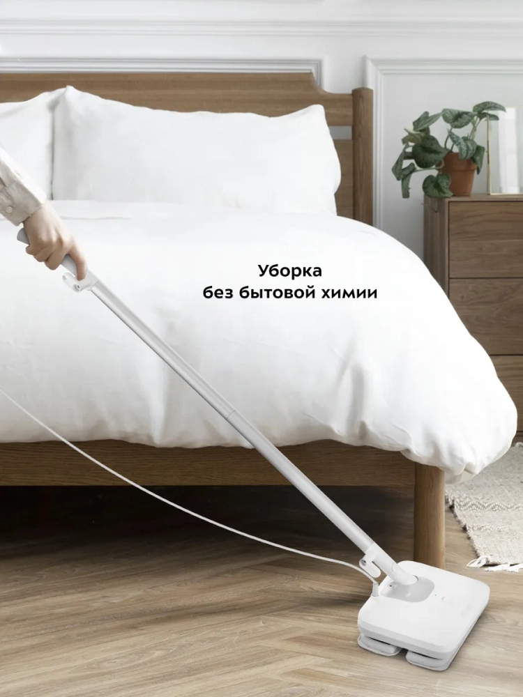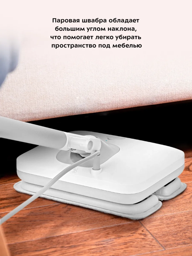 Паровая швабра обладает функцией вертикальной парковки и большим углом наклона, что помогает легко убирать пространство под мебелью. Напольная щетка закреплена на специальном шарнире с вращением в двух плоскостях.