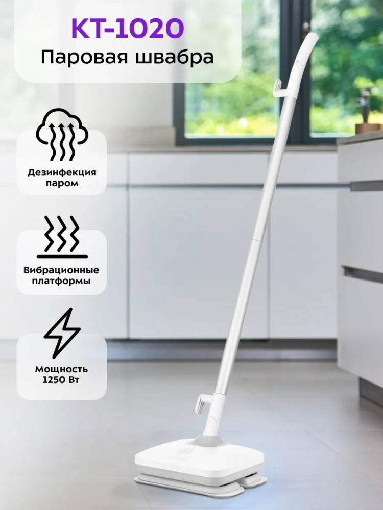 Паровая вибрационная швабра Kitfort КТ-1020 — универсальное устройство, которое поможет избавиться от пыли и грязи с помощью мощной струи пара, а также продезинфицирует обрабатываемую поверхность. КТ-1020 очистит пол без каких-либо химических средств, исключительно паром. Вибрации, создаваемые во время работы, значительно повышают качество уборки. Паровая вибрационная швабра подходит для уборки твердый и гладких напольных покрытий, не рекомендуется использовать устройство для чистки ковровых напольных покрытий.