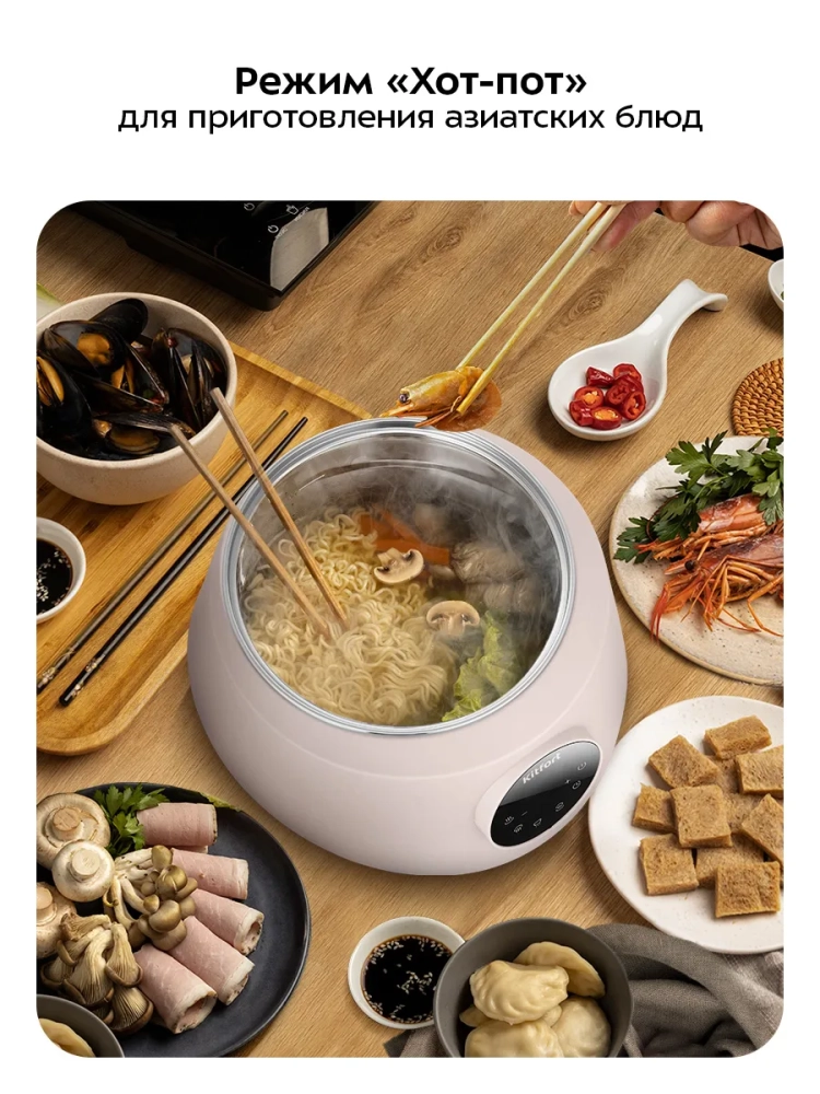 В пароварке КТ-9928 вы можете не только готовить блюда на пару, но и варить супы и использовать прибор для приготовления блюда хот-пот (хого). Название «хот-пот» используют для обозначения и самого блюда, и способа приготовления. В основе этого блюда лежит приготовление различных продуктов (мяса, морепродуктов, грибов и овощей), нарезанных на маленькие кусочки, в кипящем бульоне. Приготовление происходит во время приема пищи: кипящий бульон помещается в центр стола. С пароваркой КТ-9928 вы сможете устроить обед или ужин в лучших традициях азиатской кухни.