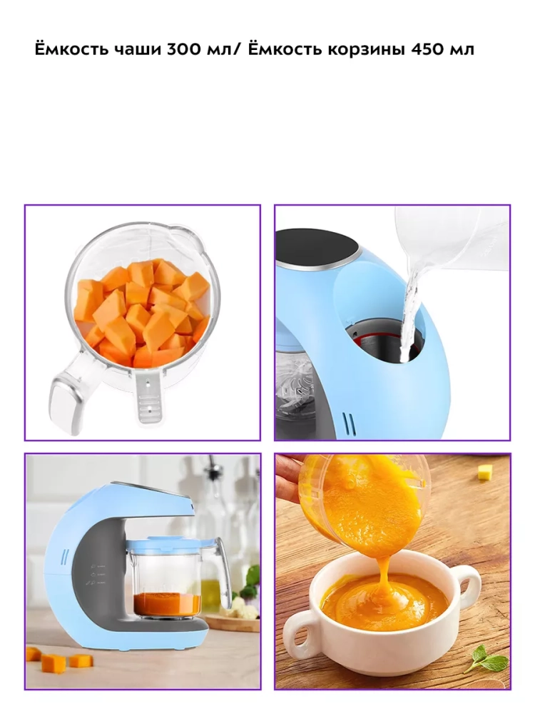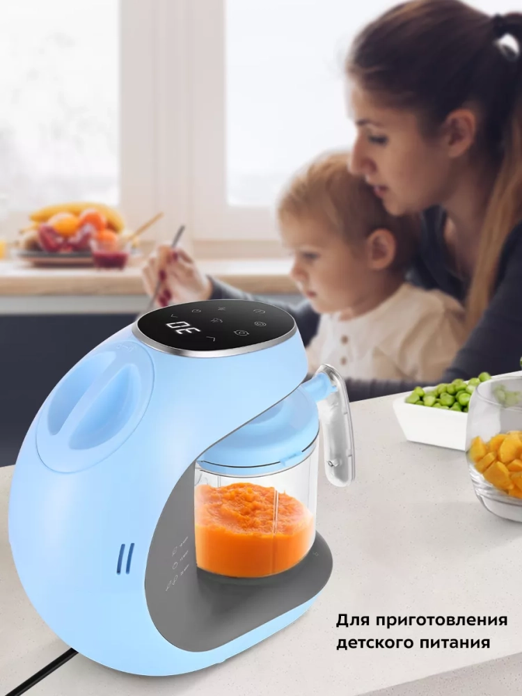 Блендер, встроенный в прибор, позволяет измельчать продукты до нужной консистенции, что особенно важно для прикорма малышей. Чаша с крышкой и моторный блок обеспечивают надежность и безопасность в процессе использования. Управление прибором интуитивно понятное, что делает его доступным для использования даже в условиях ограниченного времени.
