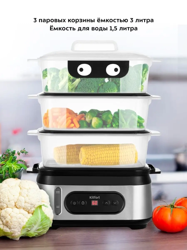 Пароварка Kitfort КТ-4082 приготовит вам вкусные и питательные блюда, сохранив все полезные витамины и микроэлементы, содержащиеся в продуктах. Продукты, приготовленные в пароварке, получаются нежными, мягкими и сочными. Пароварка станет надежным помощником для всех, кто питается диетическими блюдами и просто беспокоится о правильности своего питания.