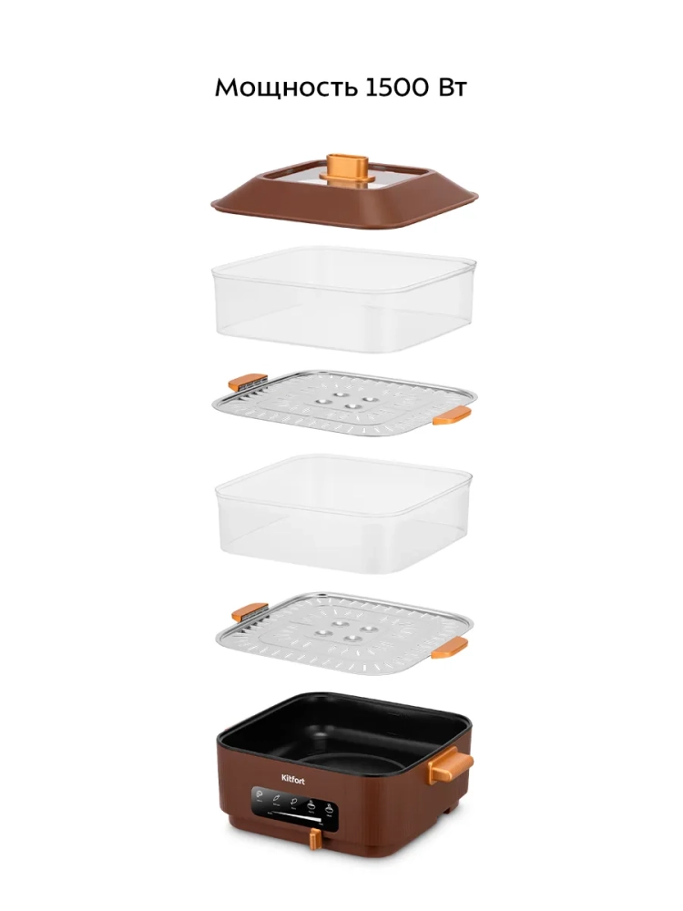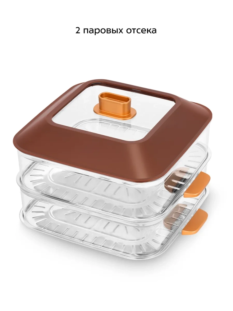 Пароварка оснащена двумя паровыми отсеками и крышкой с ручкой. У прибора также есть два основания, одно из которых можно установить между паровым отсеком и пароваркой, а второе — между двумя паровыми отсеками. За счет разделения паровых отсеков вы можете готовить в них разные продукты одновременно. Одно из основных преимуществ пароварки — это возможность готовить сразу несколько типов продуктов, например, гарнир и мясо, что уменьшает время, проведенное на кухне.