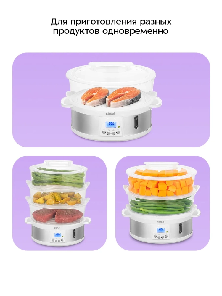 Одно из основных преимуществ пароварки — это возможность готовить сразу несколько типов продуктов, например гарнир и мясо, что уменьшает время, проведенное на кухне. С пароваркой КТ-6922 вы получите полезные блюда с минимумом усилий.