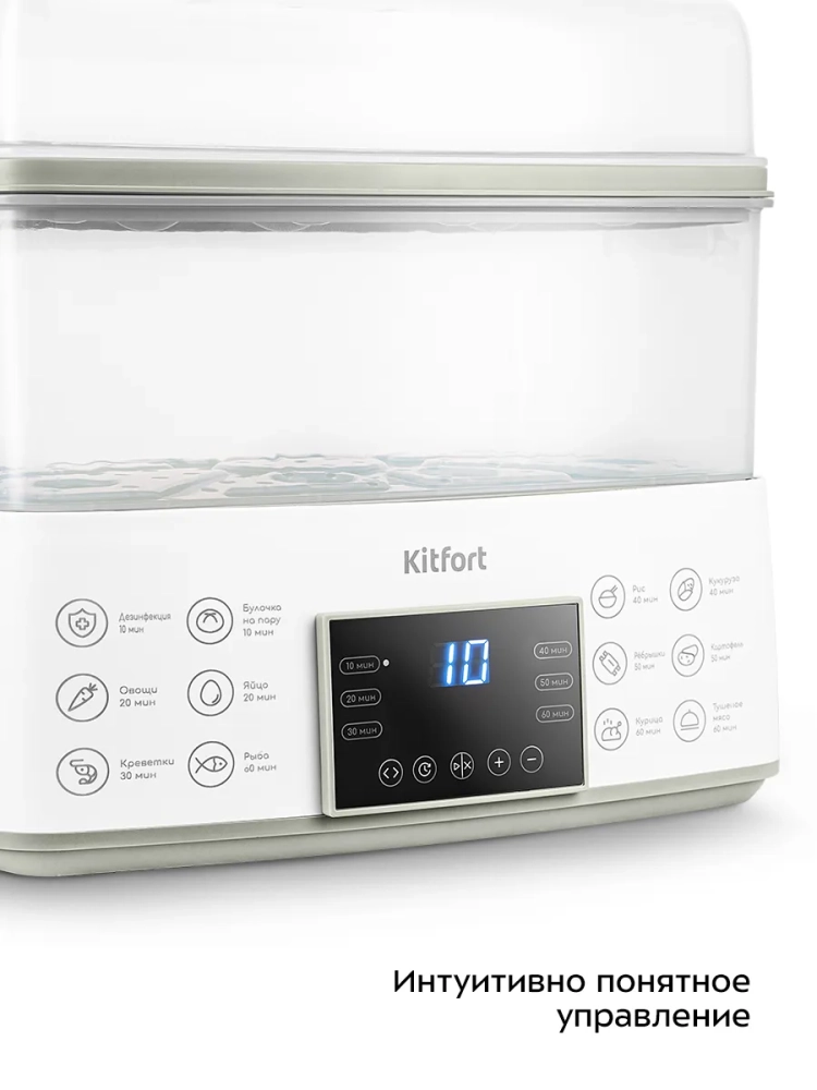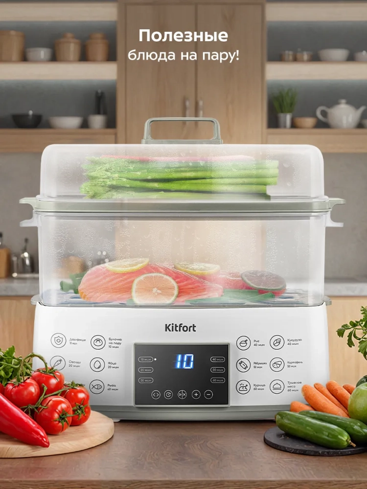 Пароварка Kitfort КТ-6431 приготовит вам вкусные и питательные блюда, сохранив все полезные витамины и микроэлементы, содержащиеся в продуктах. Приготовленные в пароварке продукты получаются нежными, мягкими и сочными. Пароварка станет надежным помощником для всех, кто питается диетическими блюдами и просто заботится о правильности своего питания.