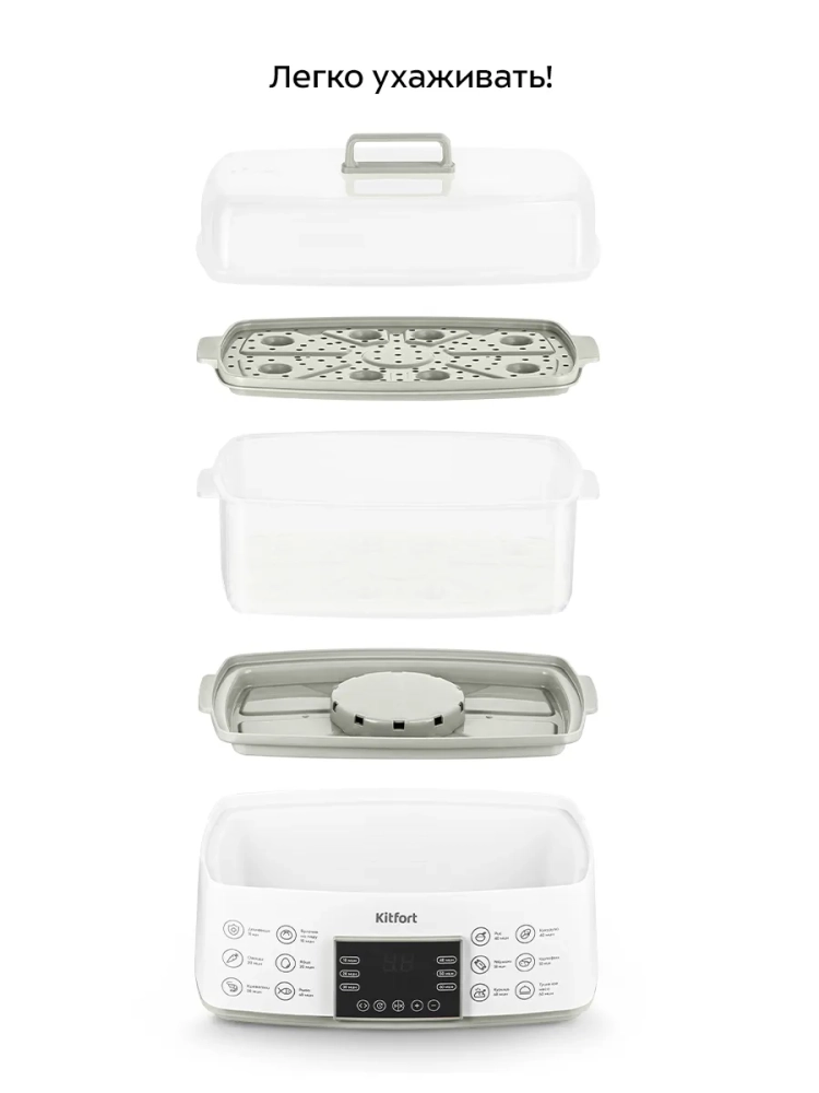 Одно из основных преимуществ пароварки — это возможность готовить сразу несколько типов продуктов, например гарнир и мясо, что уменьшает время, проведенное на кухне. С пароваркой КТ-6431 вы получите полезные блюда с минимумом усилий.