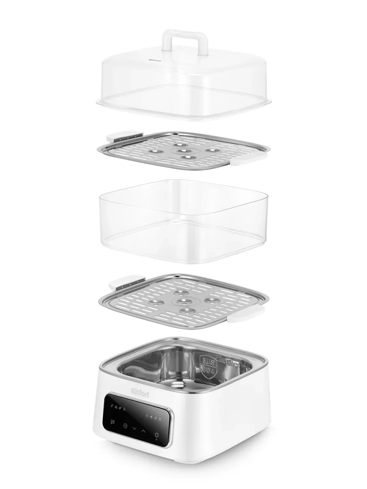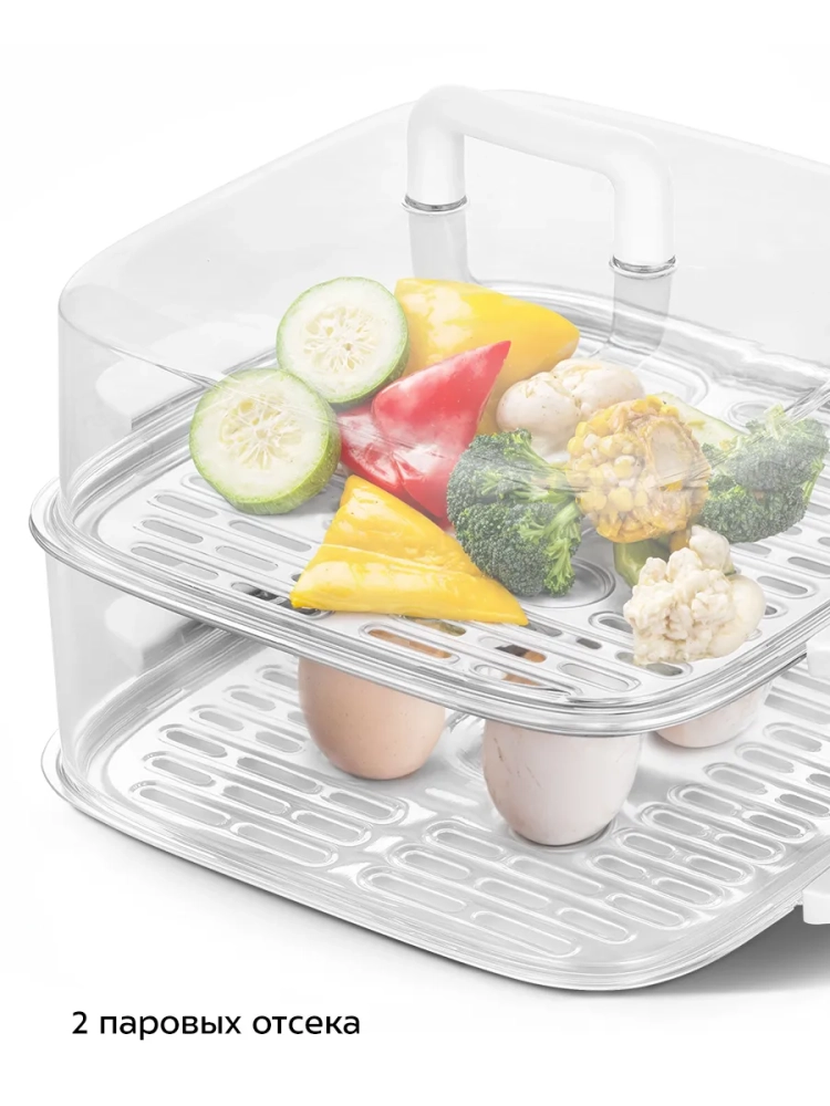 Пароварка оснащена паровым отсеком и крышкой с ручкой. У прибора также есть два специальных основания, одно из них можно установить между паровым отсеком и пароваркой, а второе — паровым отсеком и крышкой. За счет разделения парового отсека и крышки вы можете готовить в пароварке разные продукты одновременно.
