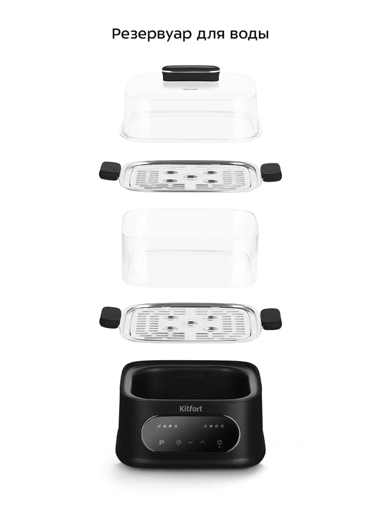 Пароварка оснащена паровым отсеком и крышкой с ручкой. У прибора также есть два специальных основания, одно из них можно установить между паровым отсеком и пароваркой, а второе — между паровым отсеком и крышкой. За счет разделения парового отсека и крышки вы можете готовить в пароварке разные продукты одновременно.
