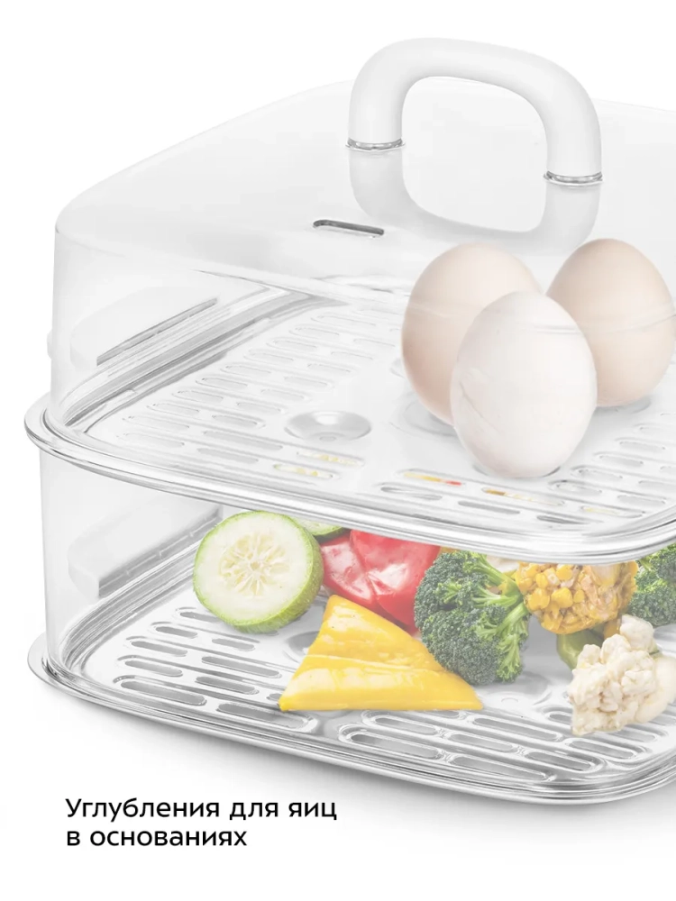 Пароварка оснащена паровым отсеком и крышкой с ручкой. У прибора также есть два основания, одно из которых можно установить между паровым отсеком и пароваркой, а второе — паровым отсеком и крышкой. За счет разделения парового отсека и крышки вы можете готовить в пароварке разные продукты одновременно. Одно из основных преимуществ пароварки — это возможность готовить сразу несколько типов продуктов, например гарнир и мясо, что уменьшает время, проведенное на кухне.