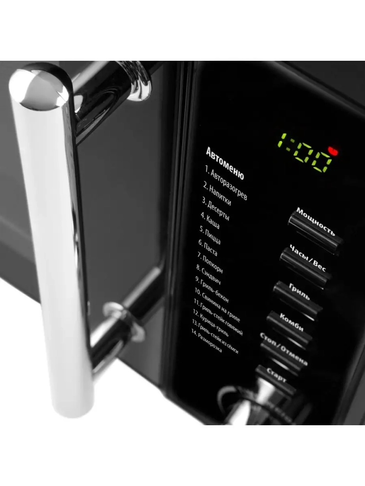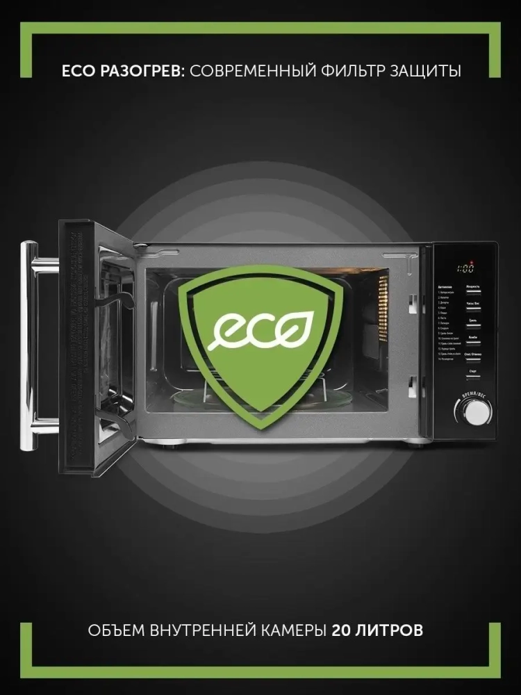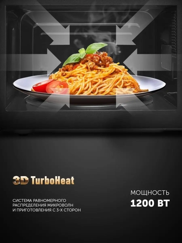 3D TurboHeat: система равномерного распределения микроволн и приготовления с 3-х сторон. ECO разогрев: современный фильтр защиты. PRO-3 EASY CARE: инновационное покрытие легкой очистки. Эффективная защита магнетрона. 14 программ автоменю. Функция размораживания по весу. Объем внутренней камеры: 20 л. 10 лет гарантии на покрытие от коррозии. Рабочая мощность 700 Вт. Номинальная потребляемая мощность 1200 Вт. Режим Гриль. Номинальная рабочая мощность гриля 850 Вт. Вращающееся стеклянное блюдо, d 245 мм. Подсветка во время работы. ЖК-дисплей. Блокировка от детей.