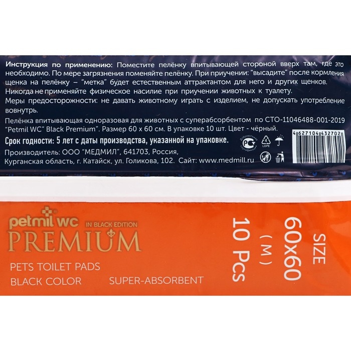 Пеленка-туалет "Petmil WC" Black Premium" состоит из: гидрофильного спанбонда (100% PP),