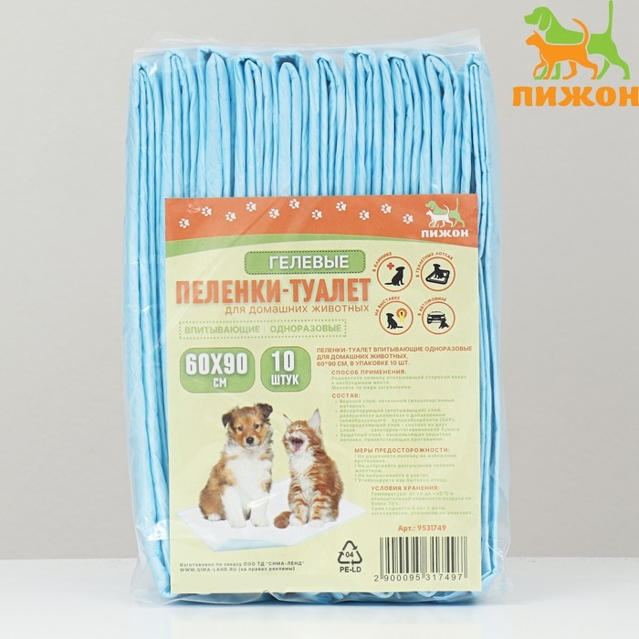 Пеленки впитывающие "ПИЖОН" для животных гелевые, 60 х 90 см, (в наборе 10 шт)