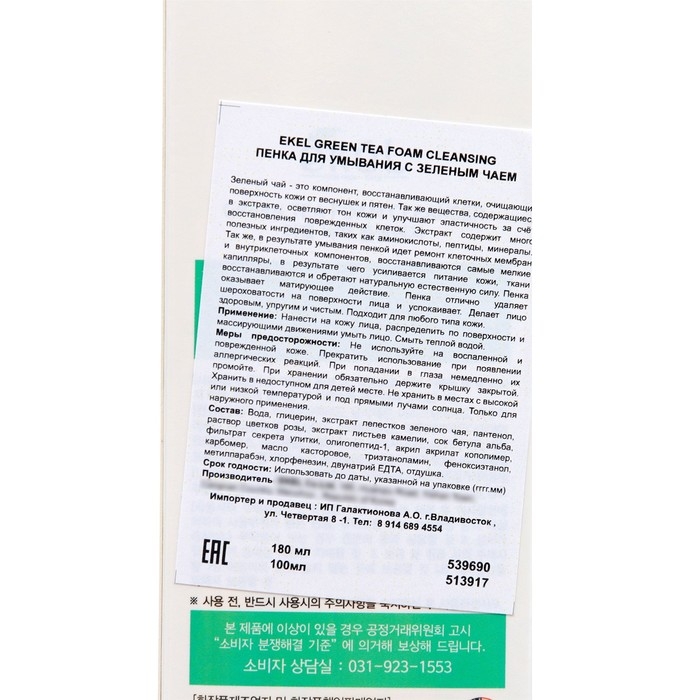 Корейская пенка для умывания Ekel Foam Cleanser 100 мл Green Tea в составе которго, базовым активным компонентом является экстракт зеленого чая, который оказывает противовоспалительное действие, уничтожает микробы и бактерии на поверхности кожи, предотвращает их размножение и появление новых воспалений. Пена для умывания с зеленым чаем очищает и сужает поры, снимает отечность тканей, улучшает снабжение клеток кислородом, увлажняет кожу, смягчает агрессивное воздействие УФ-излучения.