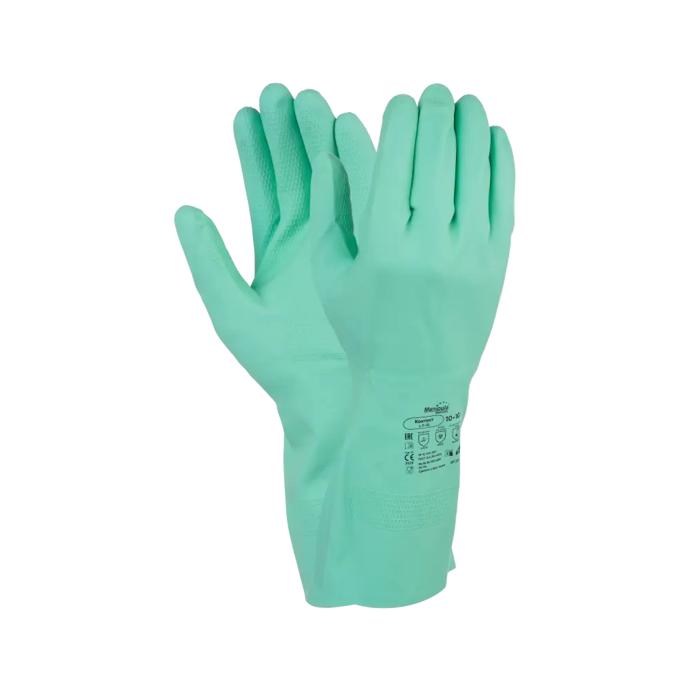 Данное изделие изготовлено из латекса. Рабочая поверхность перчаток L-F-02 (Контакт) Protector обеспечивает наиболее лучшее сцепление с предметами. На ладони и пальцах рабочая поверхность рельефная. Внутренний слой, выполненный из хлопка, предотвращает запотевание рук. А хлорированная поверхность позволяет убирать латексные протеины, а также улучшает механическую прочность изделию. Это средство защиты рук кислотоустойчивое и щелочеустойчивое (К60Щ50). Перчатки нашли применение в следующих областях: в химической, пищевой рыбной промышленности, в медицине, в ЖКХ, при уборке и в других сферах.
