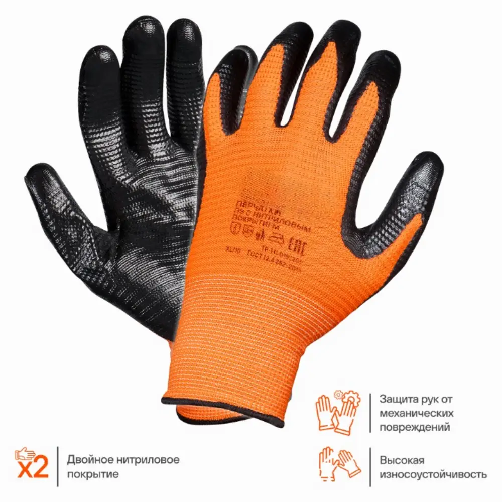 Изготовлены из полиэфира и пропитаны двуми слоями нитрила в области ладони и пальцев. Двухслойное покрытие, обеспечивает надежную защиту от механических повреждений, хороший захват скользких предметов, отлично защищает от грязи и различных жидкостей. Перчатки отличаются высокими показателями защиты и создают барьер для попадания на кожу рук вредных веществ.