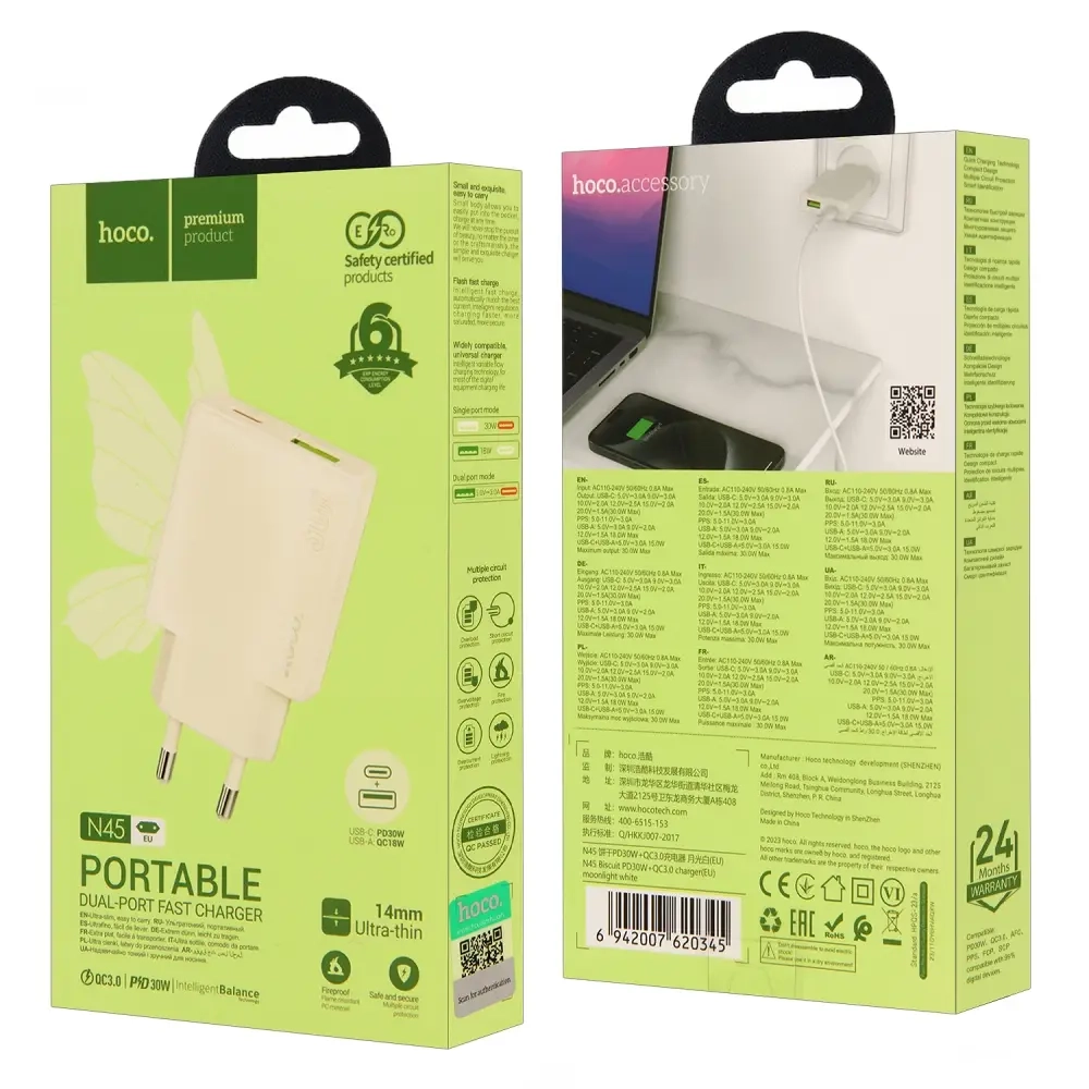 Переходник N45 СЗУ на USB QC3.0 + Type-C PD30W HOCO молочно-белый
