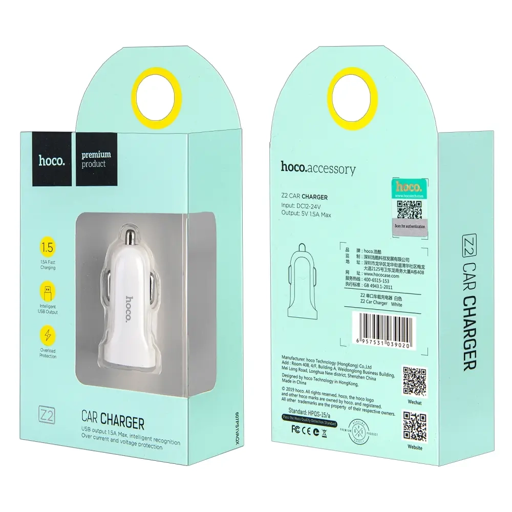 * Переходник Z2 АЗУ на USB 1.5A HOCO белый