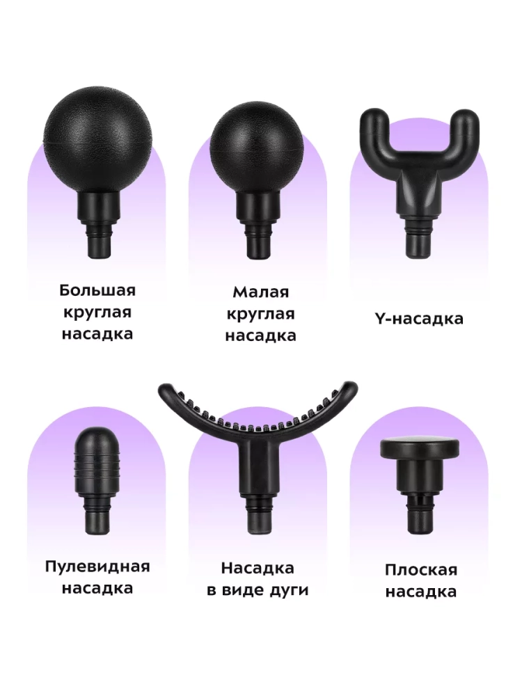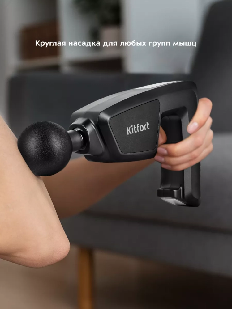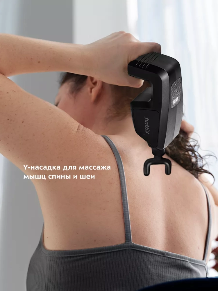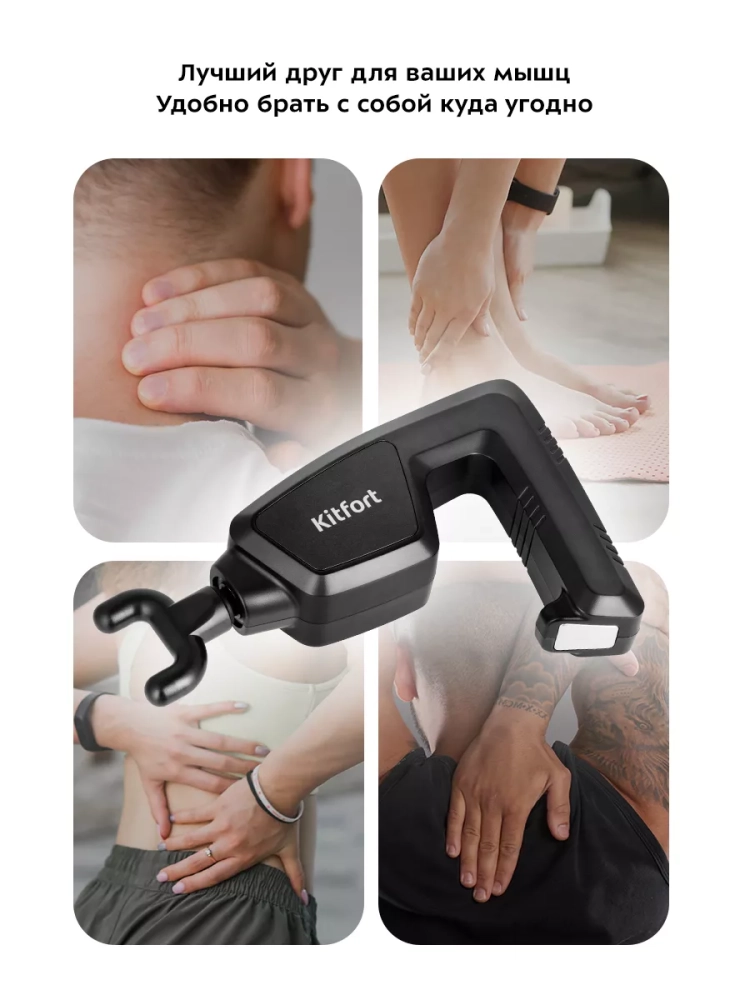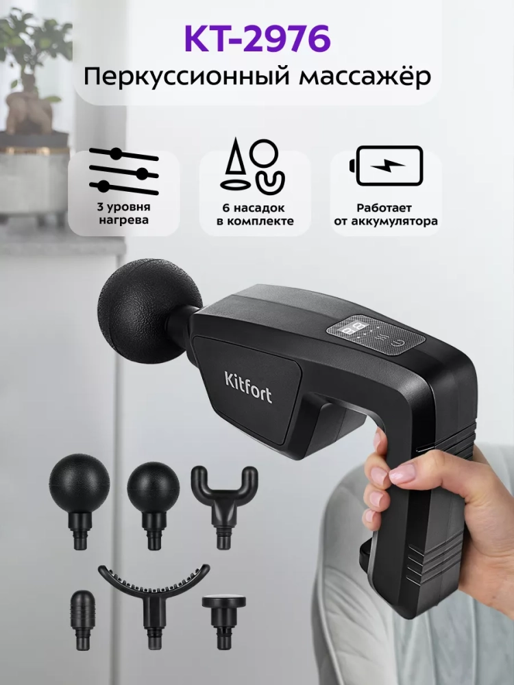 Перкусионный массажер для тела Kitfort KT-2976 поможет избавиться от мышечной усталости, боли и спазмов. Массажер использует ударную терапию для разминания мышц, фасций, увеличения притока крови к ним. Массажер может использоваться спортсменами перед, во время и после тренировок, поможет расслабить мышцы спины и шеи офисным работникам. Ударный массажер позволяет восстановить свободу движений, избавиться от токсических продуктов обмена веществ и улучшает кровообращение. Силу массажного воздействия можно регулировать с помощью кнопки на верхней части устройства. 6 скоростей позволяют подобрать комфортный, действенный массаж для различных участков тела, как для нетренированного человека, так и для спортсмена. У массажера также есть 3 уровня нагрева 40 °С, 50 °С и 60 °С. Небольшая прямоугольная пластина, которая расположена на ручке прибора, нагревается и ее можно приложить к любому участку тела. Точечный прогрев расслабляет мышцы, эффективен против зажимов, подготавливает мышцы к массажу. Насадки разных видов предназначены для воздействия на разные группы мышц и отдельные мышцы. Плоская насадка применяется для разогрева всего тела. Насадка в виде дуги применяется для массажа икр, бедер, боков, бицепса и трицепса. Пулевидная насадка действует на проблемные зоны, прорабатывает триггеры и помогает расправить зажатые фасциальные волокна. Y-насадка используется для массажа мышц шеи, трапециевидной мышцы и мышц вдоль позвоночника. Большая и малая круглые насадки более универсальные и используются почти для любых групп мышц, отлично подходят для проработки широких и крупных мышц. Также в комплекте идет массажная лента, которая позволяет массировать большую площадь тела. Усилить массажный эффект можно тремя съемными блоками, которые крепятся к ленте на липучках. Модель КТ-2976 работает от аккумулятора, поэтому массажер можно брать с собой и использовать в любом удобном месте: в спортзале, в офисе, в поездках, в походах или дома.