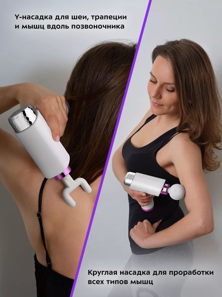 Насадки четырех видов предназначены для воздействия на группы мышц и отдельные мышцы. Пулевидная насадка применяется для «разбивания» триггеров, проработки тканей и точечного массажа стоп. Чрезмерное напряжение, резкие движения, растяжение провоцирует возникновение триггерных точек — плотных болезненных узлов в мышцах. Пулевидная насадка действует на проблемные зоны, прорабатывает триггеры и помогает расправить зажатые фасциальные волокна. Y-насадка используется для массажа мышц шеи, трапеции, и мышц вдоль позвоночника. Плоская насадка отлично подходит для широких типов мышц. Круглая насадка более универсальная и проработает любые части тела.