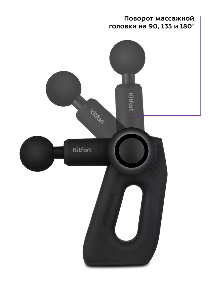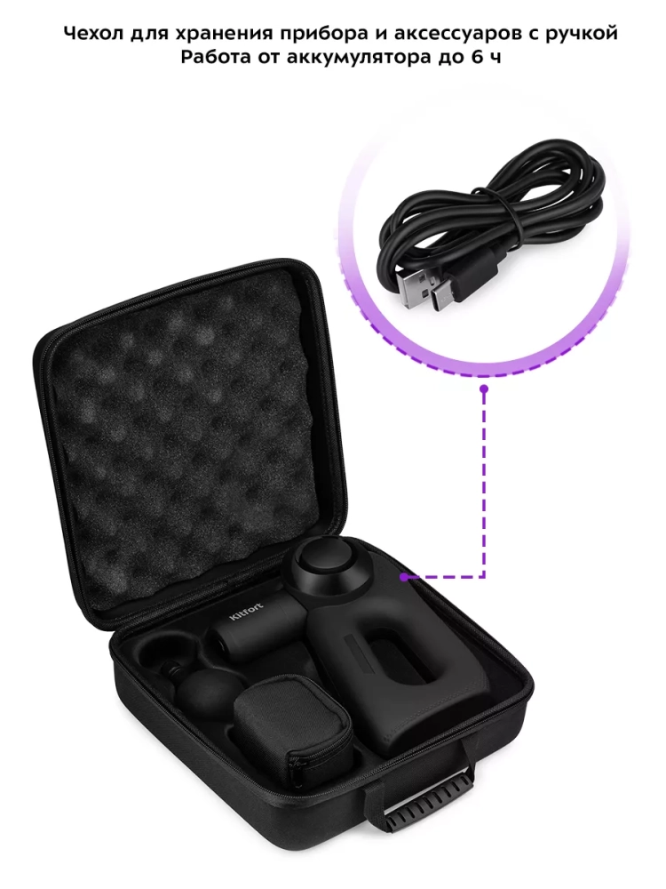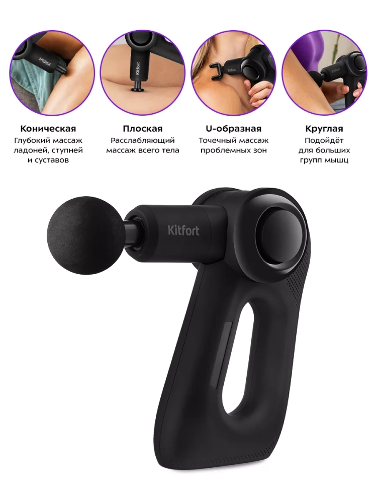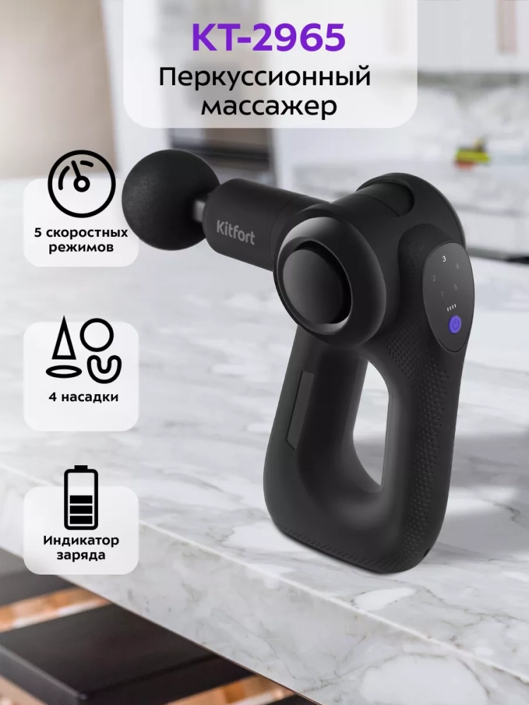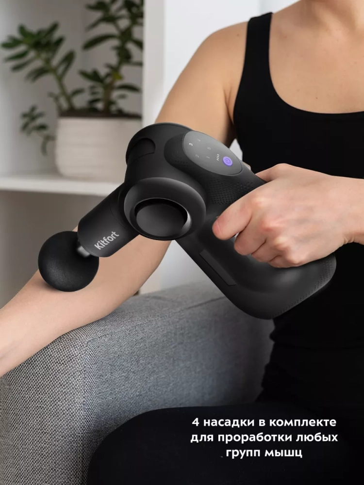 Модель Китфорт КТ-2965 работает от аккумулятора, поэтому массажер можно брать с собой куда угодно: в спортзал, в офис, в поездку или использовать дома. Можно делать массаж, не снимая одежду. Перкуссионный массажер позволит мышцам расслабиться, а также улучшит кровоток и избавит от боли.