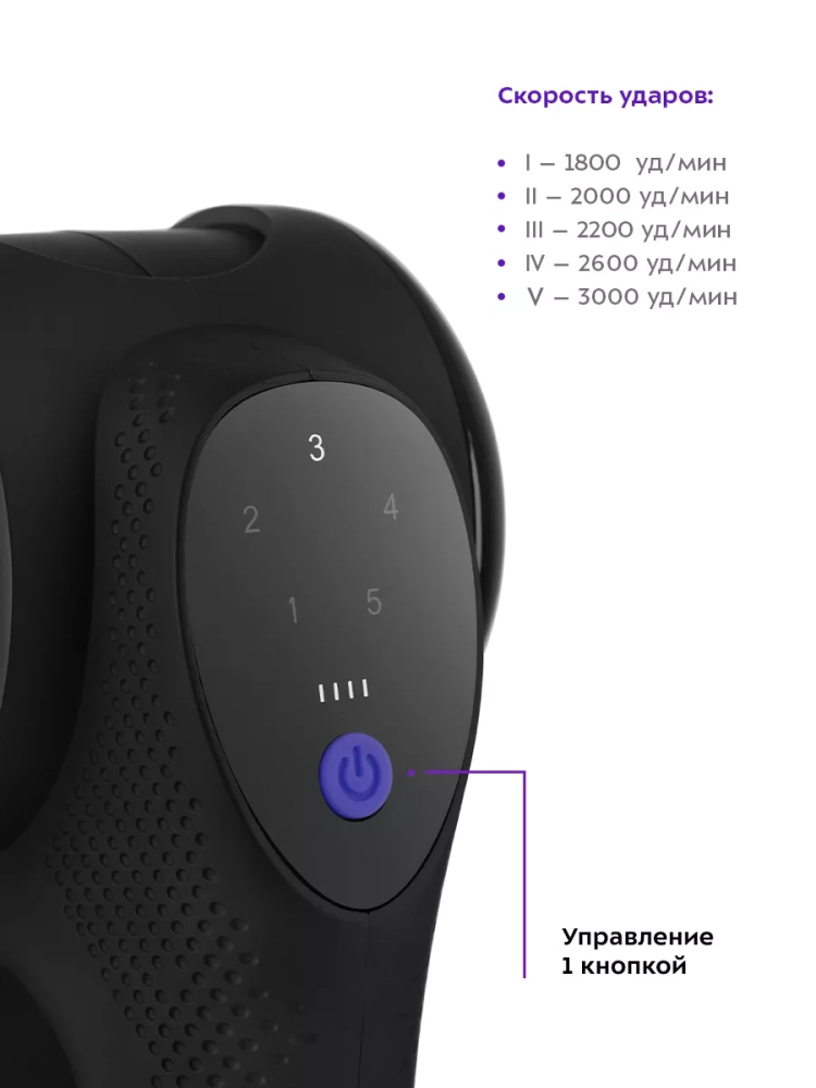 Силу массажного воздействия можно регулировать с помощью кнопки на задней стороне устройства. 5 уровней скорости позволяют подобрать комфортный, действенный массаж, как для нетренированного человека, так и для спортсмена.