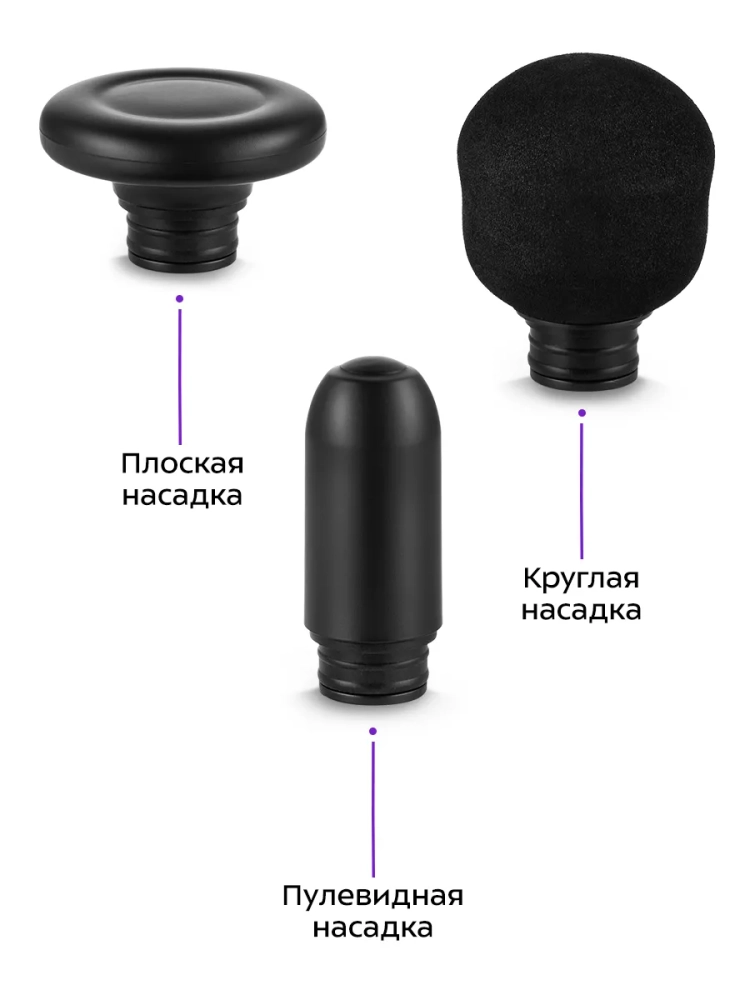 Насадки разных видов предназначены для воздействия на группы мышц и отдельные мышцы. Пулевидная насадка применяется для «разбивания» триггеров, проработки тканей и точечного массажа стоп. Чрезмерное напряжение, резкие движения, растяжения провоцирует возникновение триггерных точек — плотных болезненных узлов в мышцах. Пулевидная насадка действует на проблемные зоны, прорабатывает триггеры и помогает расправить зажатые фасциальные волокна. Плоская насадка отлично подходит для широких типов мышц. Круглая насадка более универсальная и подходит почти для любых групп мышц.