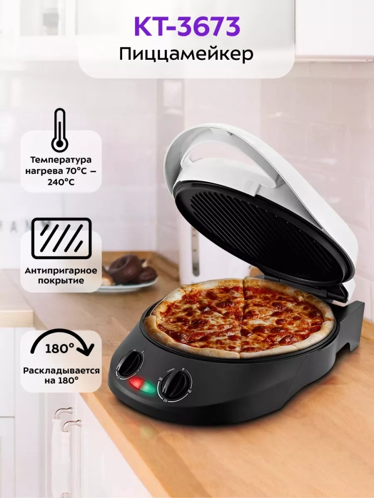 Пиццамейкер Kitfort KT-3673 — универсальное устройство, способное заменить духовку. Идеально подходит для приготовления пиццы, различных пирогов, сырников, горячих бутербродов и запеканок. Также в пиццамейкере можно готовить омлет, запеченные овощи, котлеты, мясо, рыбу и многое другое.