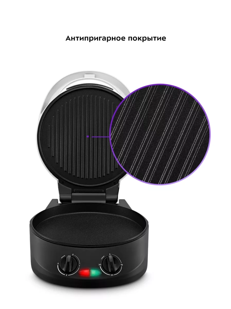 Антипригарное покрытие помогает не прилипать тесту и другим продуктам в процессе приготовления и позволяет готовить с минимальным количеством масла или без него. Также антипригарное покрытие панелей облегчает чистку, что особенно важно, так как панели являются несъемными. Пиццамейкер оснащен индикаторами питания и нагрева, термостатом для регулировки и поддержания температуры панелей и таймером. Прорезиненные ножки не дают прибору скользить по столу во время готовки.