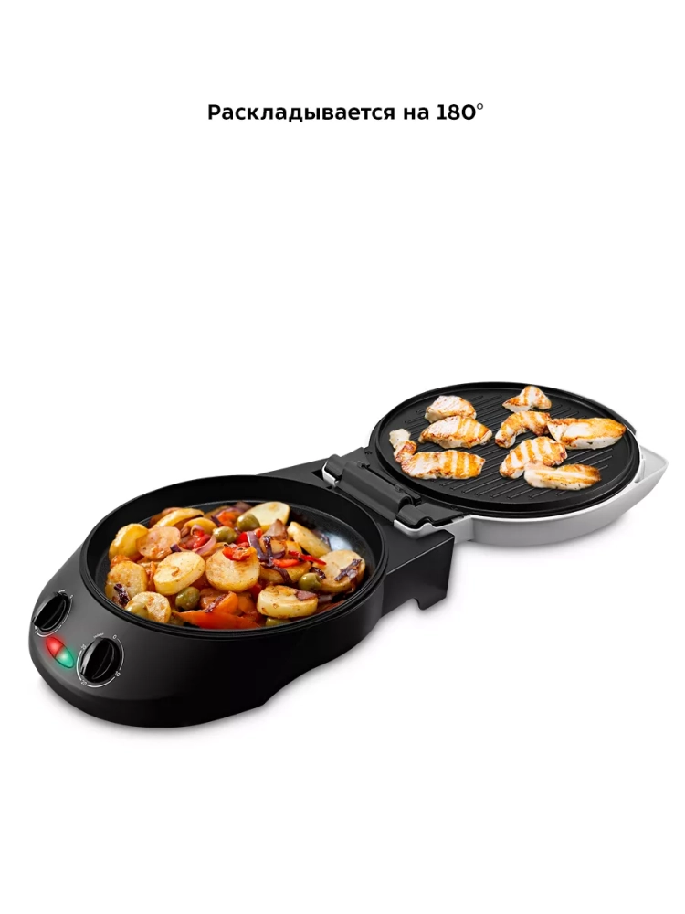 Конструкция пиццамейкера позволяет готовить в двух режимах. В двухстороннем режиме прибор закрывается крышкой. В одностороннем режиме верхняя панель откидывается на 180 °, и пиццамейкер превращается в большую жаровню — для приготовления можно использовать обе панели.