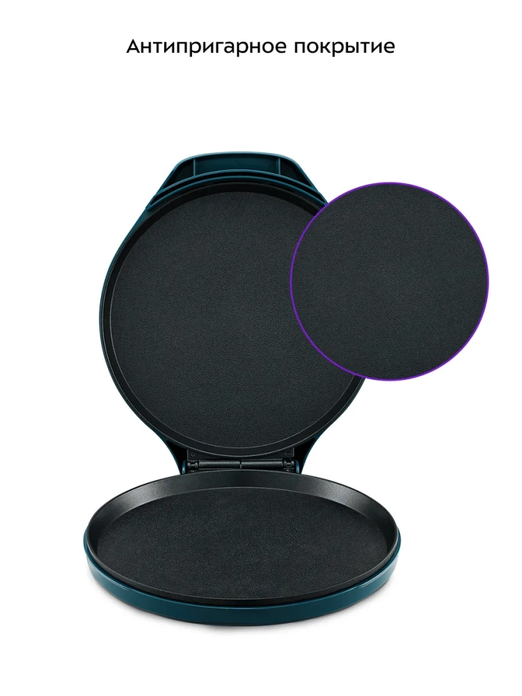 Антипригарное покрытие помогает не прилипать тесту и другим продуктам в процессе приготовления и позволяет готовить с минимальным количеством масла. Также антипригарное покрытие панелей облегчает чистку, что особенно важно, так как панели являются несъемными. Пиццамейкер оснащен регулятором температуры, а также индикаторами питания и нагрева. Прорезиненные ножки не дают прибору скользить по столу во время готовки.