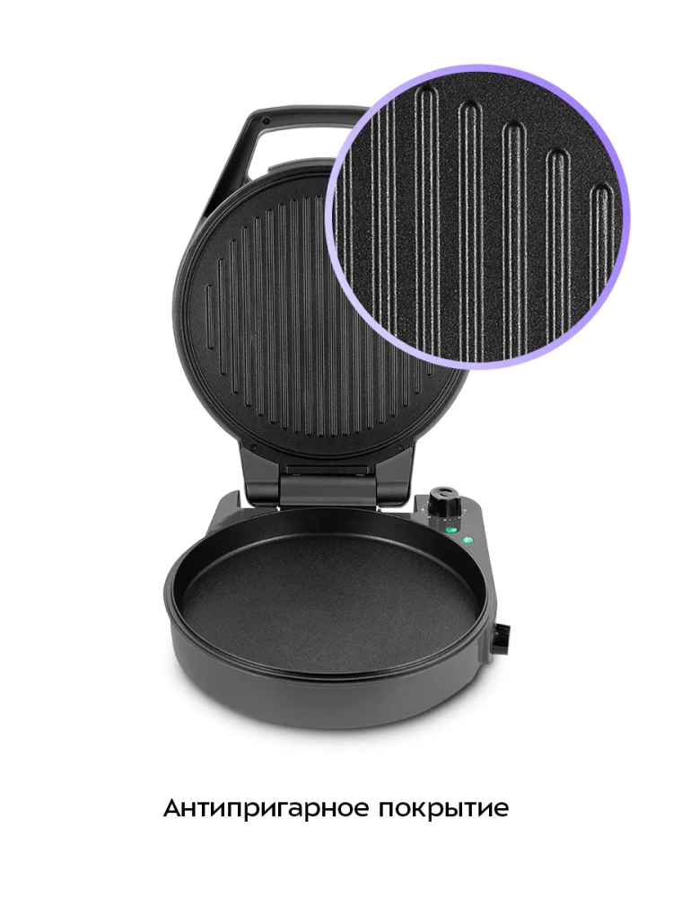 Антипригарное покрытие помогает не прилипать тесту и другим продуктам в процессе приготовления и позволяет готовить с минимальным количеством масла. Также антипригарное покрытие панелей облегчает чистку.