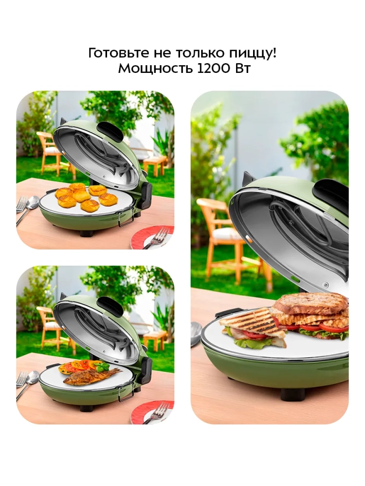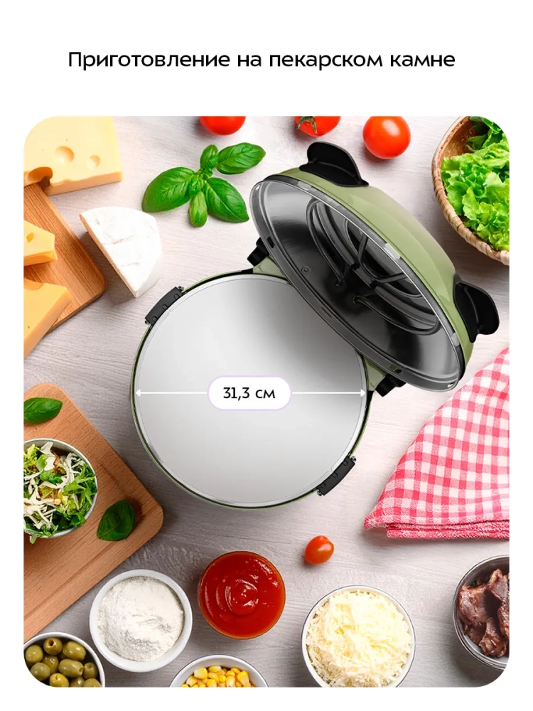 Технология приготовления пиццы в пиццамейкере максимально приближена к профессиональной печи. Нагревательные элементы расположены в корпусе и крышке прибора, а блюда выпекаются на специальном пекарском камне, который нагревается, а затем постепенно и равномерно отдает тепло. Благодаря этому пицца получается с хрустящей корочкой, а начинка остается сочной. Пекарский камень также хорошо подходит для приготовления питы, осетинских пирогов и хачапури.