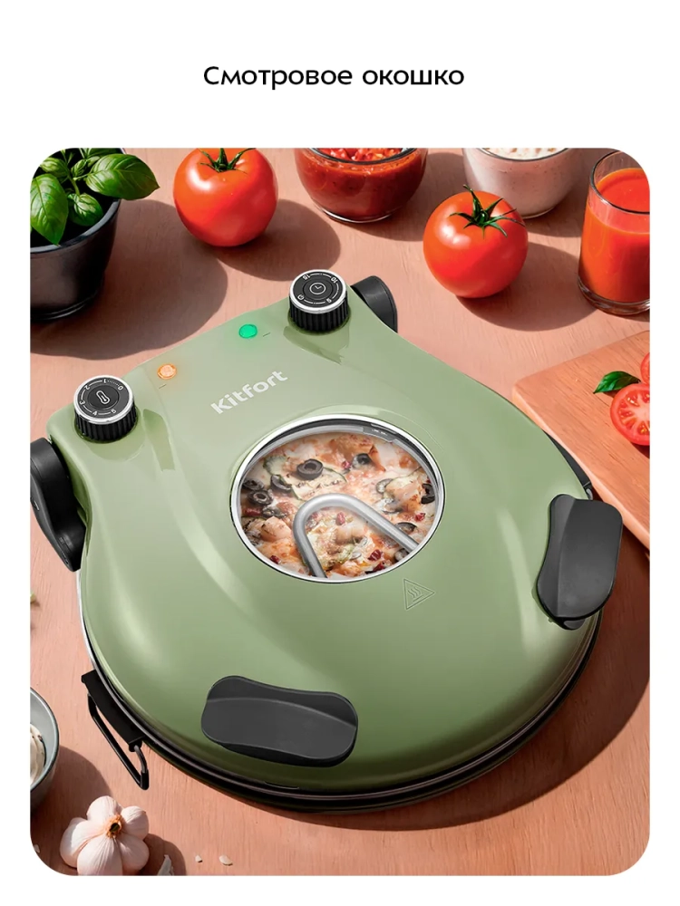 Пиццамейкер оснащен регулятором температуры и таймером, индикаторами питания и нагрева, а также смотровым окошком, через которое удобно наблюдать за процессом приготовления, не открывая крышку. Прорезиненные ножки с присосками не дают прибору скользить по столу во время готовки.