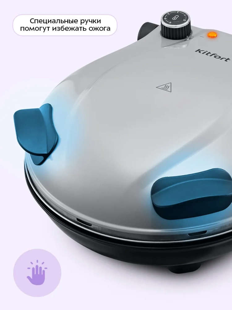 Пиццамейкер оснащен регулятором температуры, таймером и индикаторами питания и нагрева. Прорезиненные ножки с присосками не дают прибору скользить по столу во время готовки.
