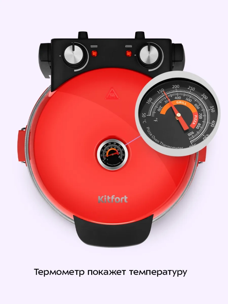 Благодаря двум регуляторам температуры в пиццамейкере можно настроить разную температуру нагрева для верхнего и нижнего нагревателей. Благодаря индикаторам нагрева понятно, какой из нагревателей работает. Пиццамейкер также оснащен термометром, который показывает текущую температуру, до которой нагрелся пиццамейкер. Прорезиненные ножки не дают прибору скользить по столу во время готовки.
