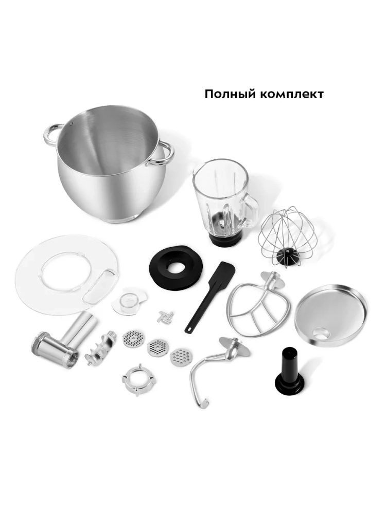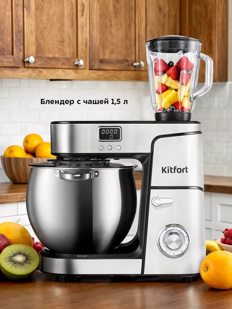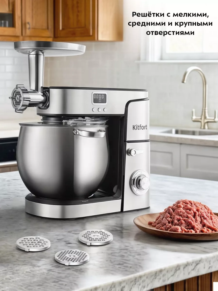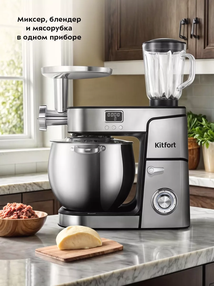 Многофункциональный планетарный миксер Kitfort КТ-3480 (3 в 1) поможет вам смешать ингредиенты, взбить яичный белок или сливки, приготовить соус, крем, мусс, замесить жидкое тесто для блинов и крутое — для пельменей и пирогов. Также он может перемолоть мясо на фарш и смешать фруктовые и фитнес-напитки, молочные коктейли, соусы и детское питание. В комплект входят мясорубка и блендер, что превращает эту модель в универсальную кухонную машину «3 в 1».