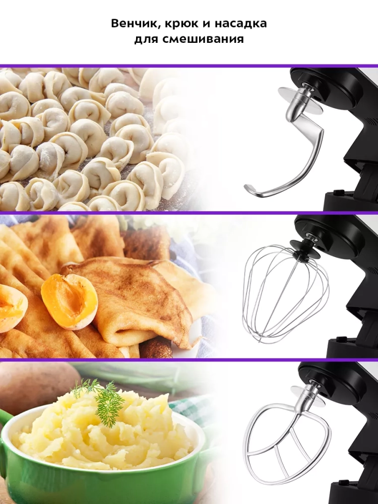 В комплекте к миксеру идут три насадки. Венчик служит для взбивания яичных белков, сливок, замешивания жидкого теста. Насадка для смешивания используется для негустых ингредиентов, приготовления картофельного пюре, томатной пасты, кондитерских смесей, теста для тортов или блинов. Крюк для замешивания подойдет для замешивания густого теста.