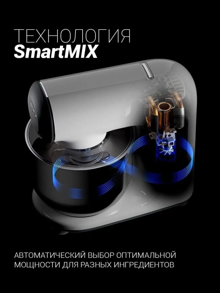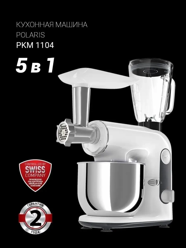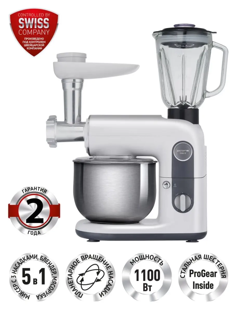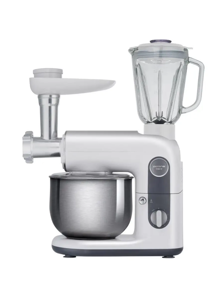 Многофункциональная кухонная машина Polaris PKM 1104 5 в 1 сочетает в себе функции планетарного миксера, мясорубки и блендера, что делает ее универсальным решением для приготовления разнообразных блюд. Благодаря технологии SmartMIX устройство автоматически подбирает оптимальную мощность для каждого вида и количества ингредиентов.