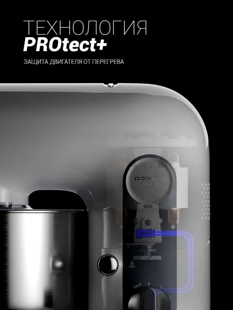 Техника для кухни оснащена резиновыми ножками-присосками, обеспечивающими отличную устойчивость на кухонном столе. Кухонная машина Поларис PKM 1104 сочетает в себе сразу несколько бытовых приборов в одном, избавляя от необходимости загромождать кухню лишними устройствами.