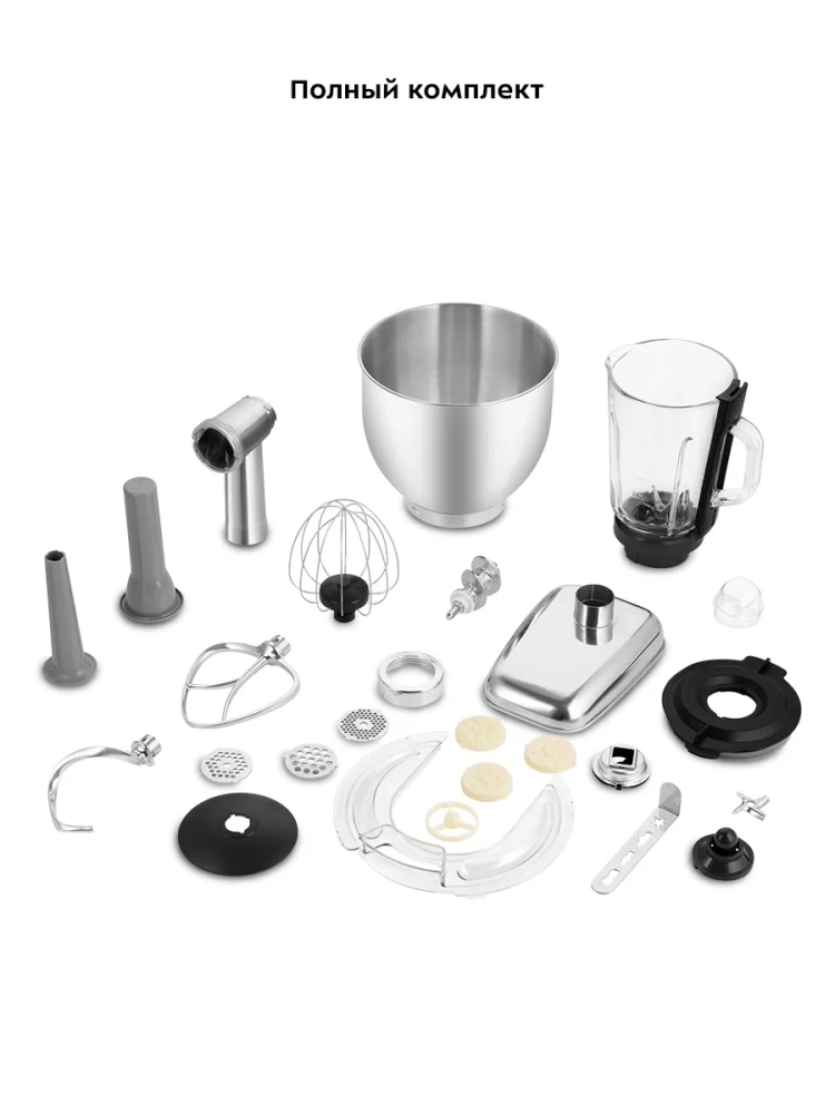 Мясорубка, входящая в комплект, оснащена тремя решетками для фарша и специальными насадками для колбас, кеббе и печенья. Насадки для пасты позволяют приготовить спагетти, макароны и тальятелле. Блендер с чашей объемом 1,5 литра из стекла идеально подходит для приготовления смузи, коктейлей и супов-пюре. Крышка блендера имеет отверстие с колпачком, который может использоваться как мерный стакан.