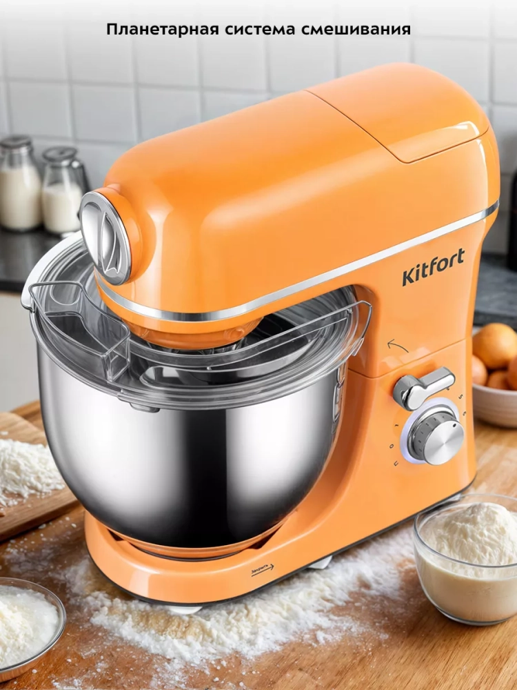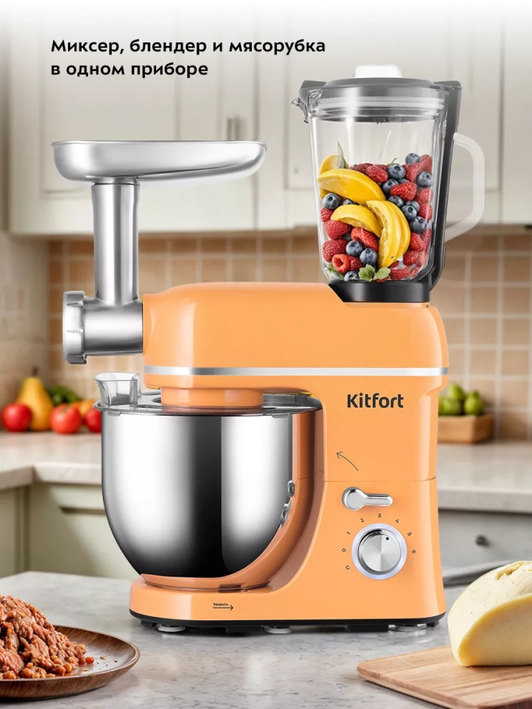Планетарный миксер Kitfort КТ-3431 — это многофункциональный кухонный комбайн, который станет незаменимым помощником на вашей кухне. Этот электрический прибор сочетает в себе функции миксера, блендера и мясорубки, что делает его идеальным решением для дома. Миксер оснащен чашей объемом 5 литров из нержавеющей стали, что позволяет смешивать даже горячие ингредиенты. Встроенная лампа подсвечивает содержимое чаши, обеспечивая контроль за консистенцией.