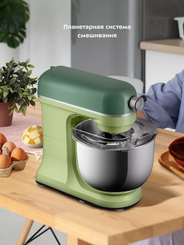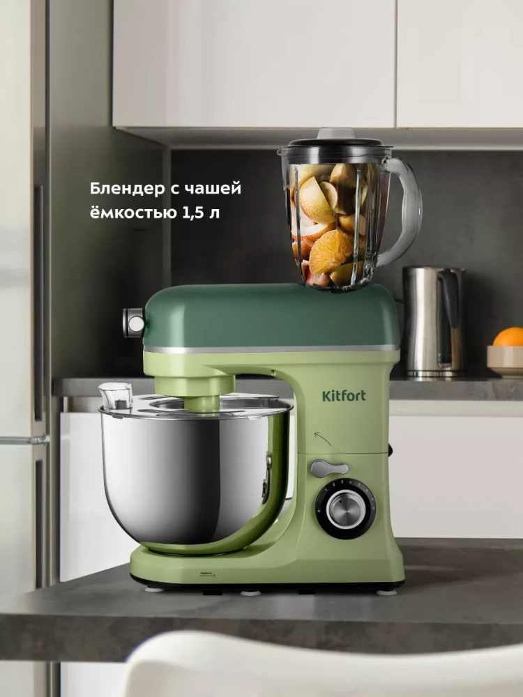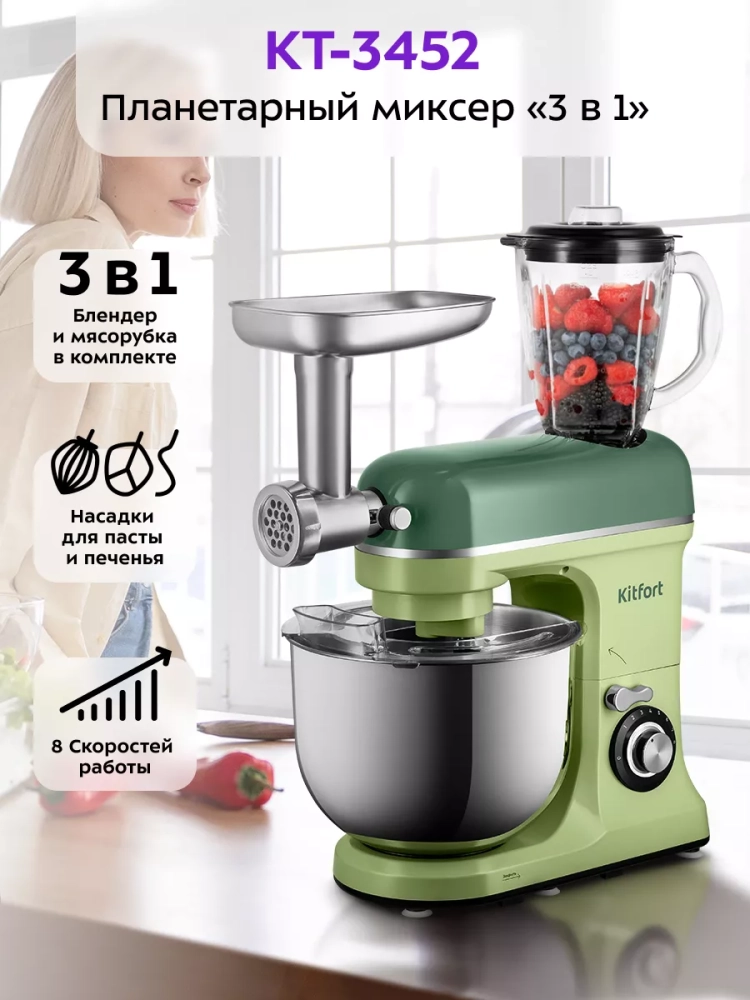 Многофункциональный планетарный миксер Kitfort КТ-3452 (3 в 1) поможет вам смешать ингредиенты, взбить яичный белок или сливки, приготовить картофельное пюре, соус, крем, мусс, замесить жидкое тесто для блинов и крутое — для пельменей и пирогов. В комплект также входит мясорубка и блендер, что превращает эту модель в универсальную кухонную машину «3 в 1».