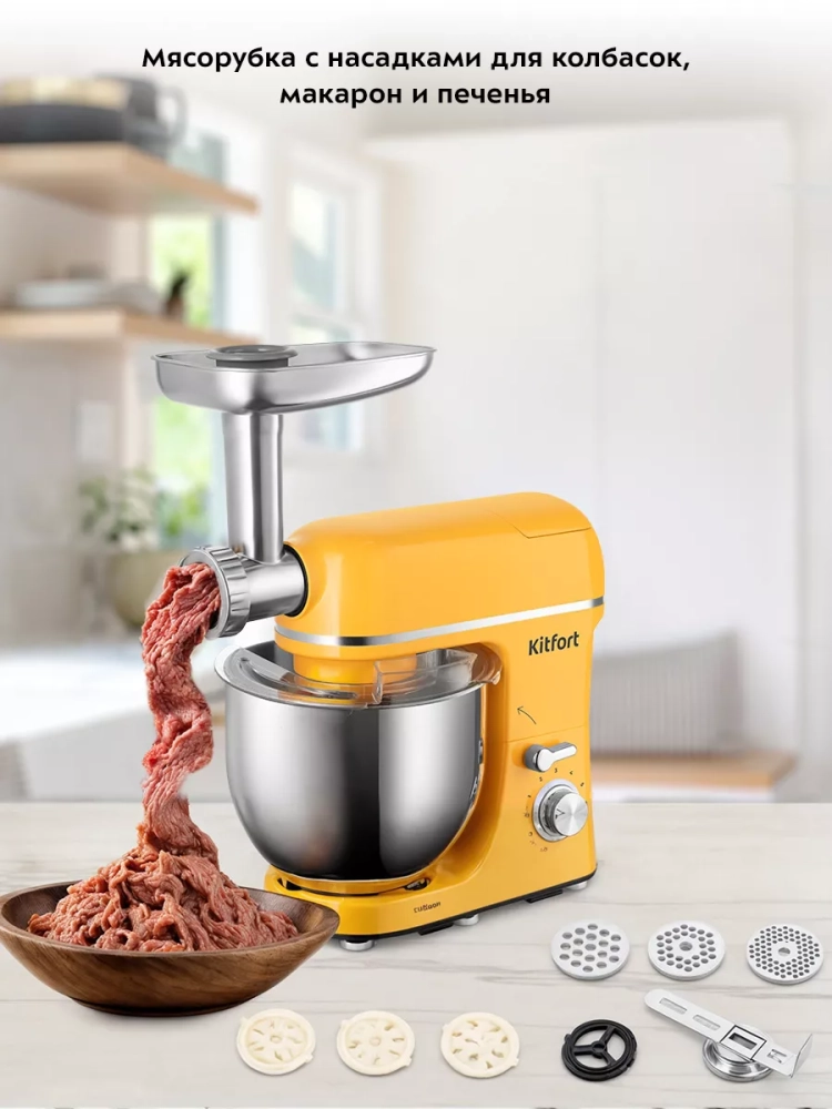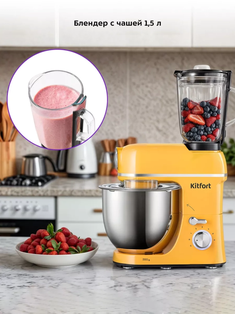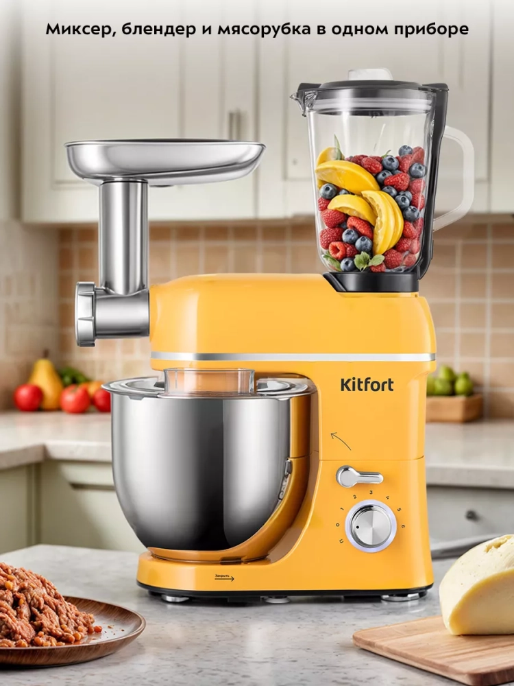Многофункциональный планетарный миксер Kitfort КТ-3458 (3 в 1) поможет вам смешать ингредиенты, взбить яичный белок или сливки, приготовить картофельное пюре, соус, крем, мусс, замесить жидкое тесто для блинов и крутое для пельменей и пирогов.