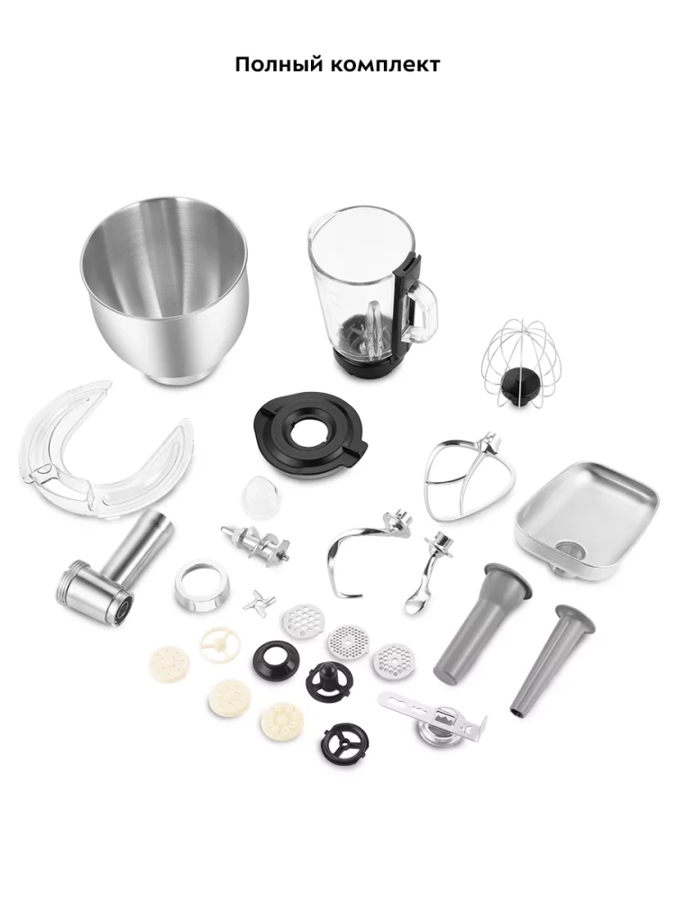 В комплекте идут венчик для взбивания, насадка для смешивания и приготовления пюре, крюки для замеса крутого теста, а также защитный кожух, который защищает шпиндель от налипания продуктов.
