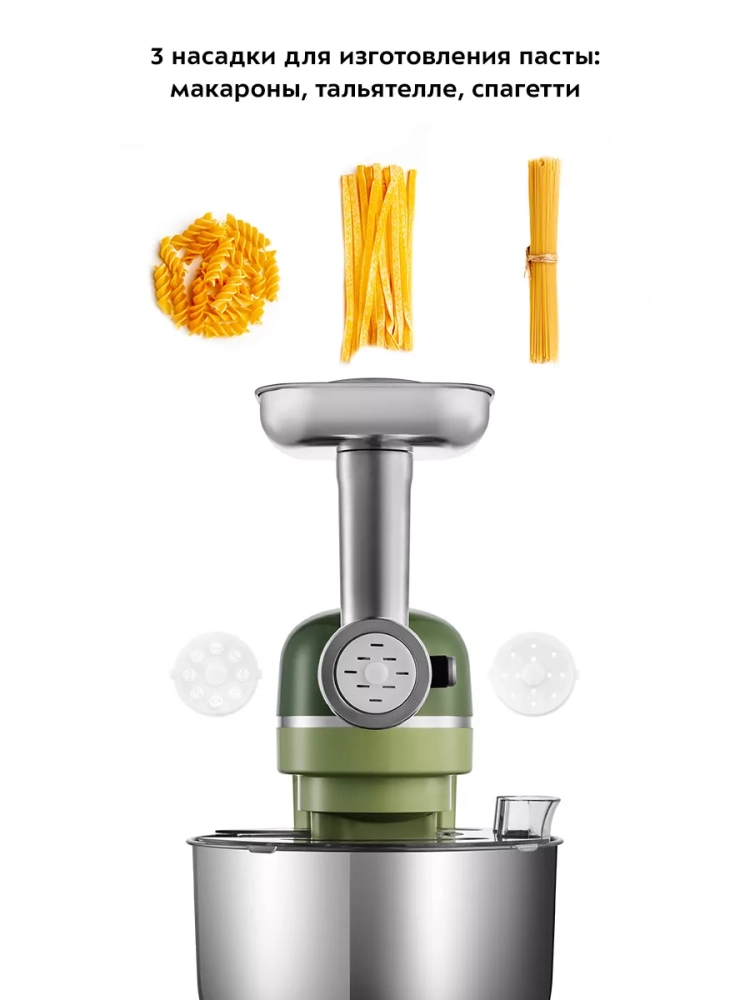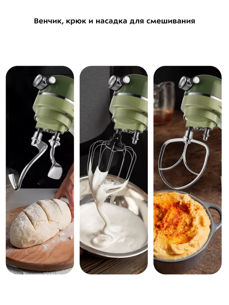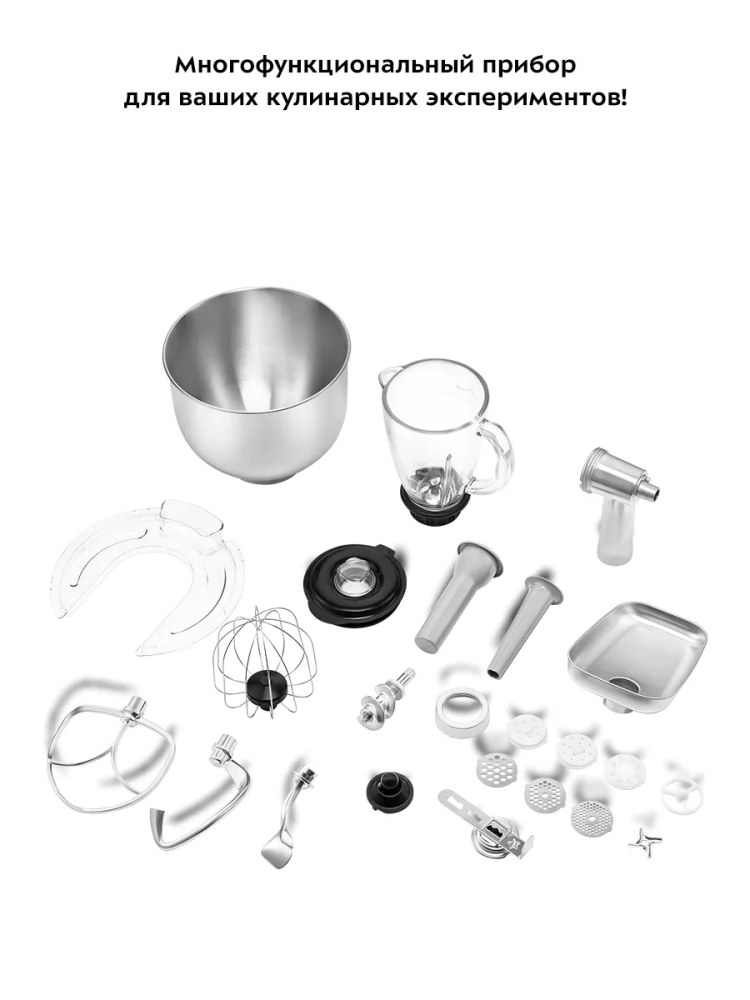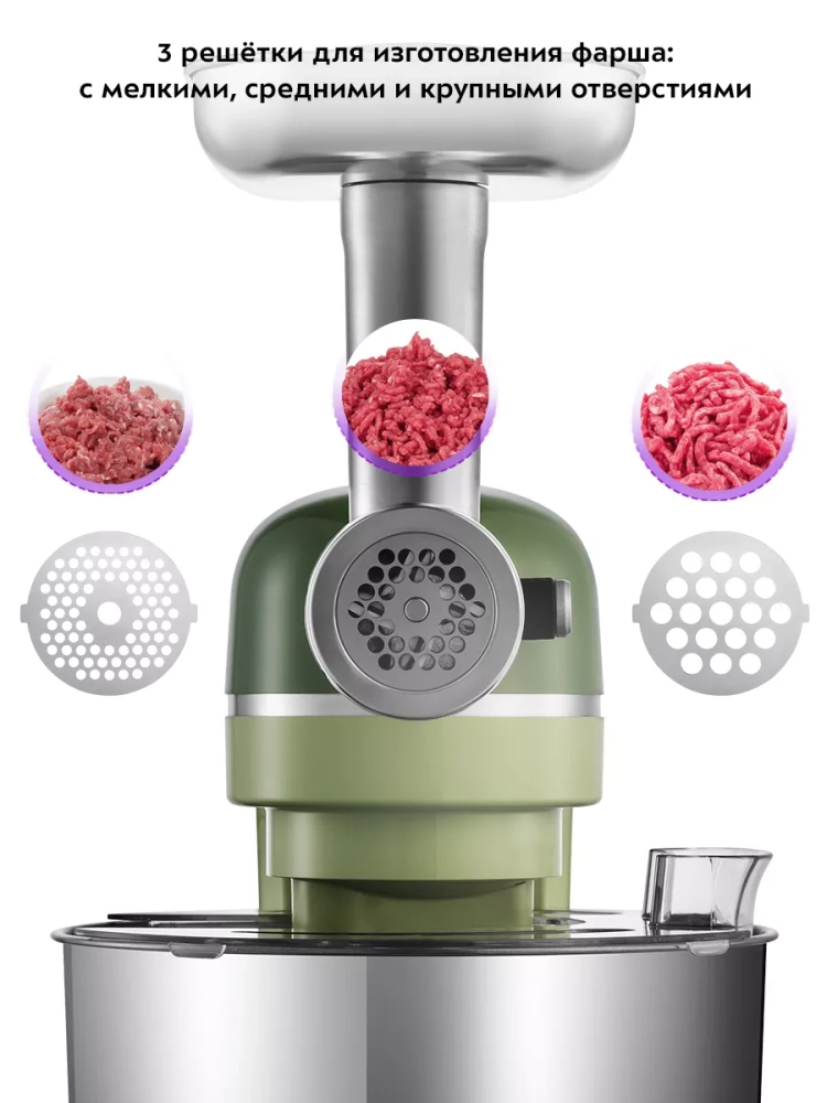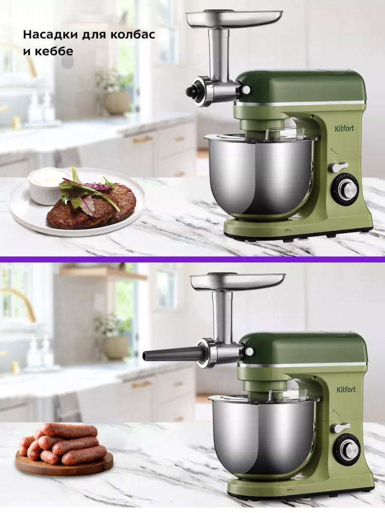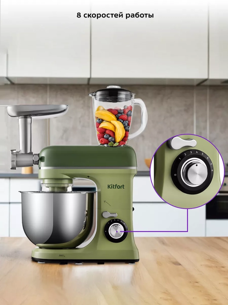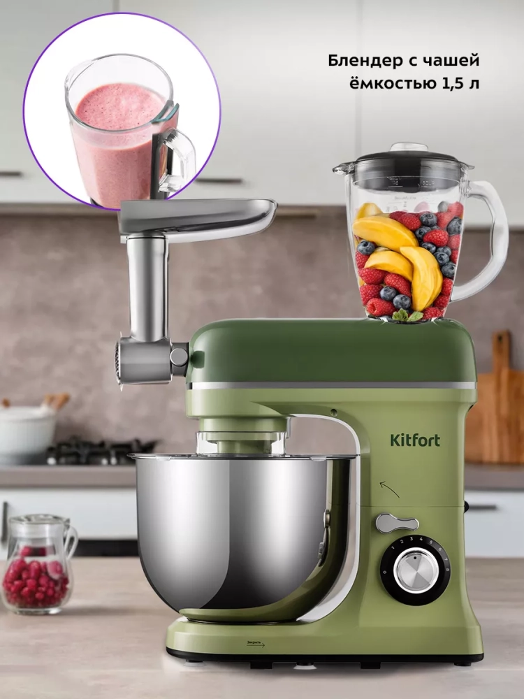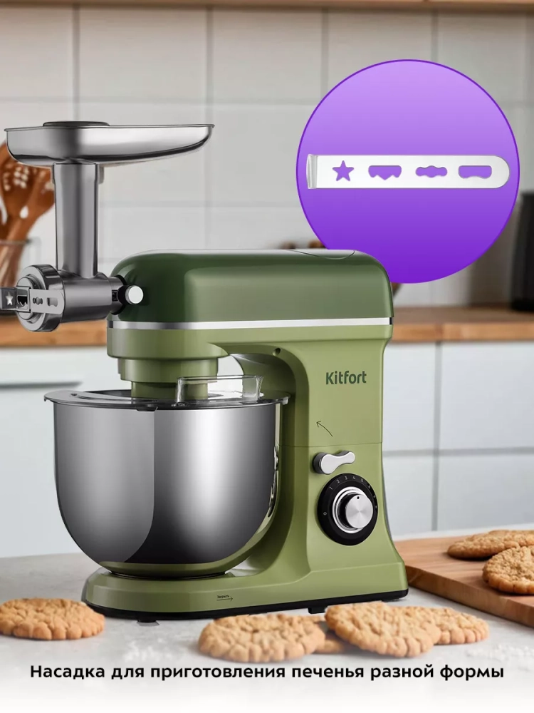 Многофункциональный планетарный миксер Kitfort КТ-3461 (3 в 1) поможет вам смешать ингредиенты, взбить яичный белок или сливки, приготовить картофельное пюре, соус, крем, мусс, замесить жидкое тесто для блинов и крутое — для пельменей и пирогов. В комплект также входит мясорубка и блендер, что превращает эту модель в универсальную кухонную машину «3 в 1».