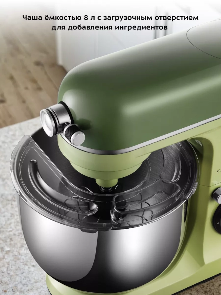 Миксер оснащен чашей емкостью 8 литров. Чаша изготовлена из нержавеющей стали, она прочная, и в ней можно смешивать даже горячие ингредиенты.