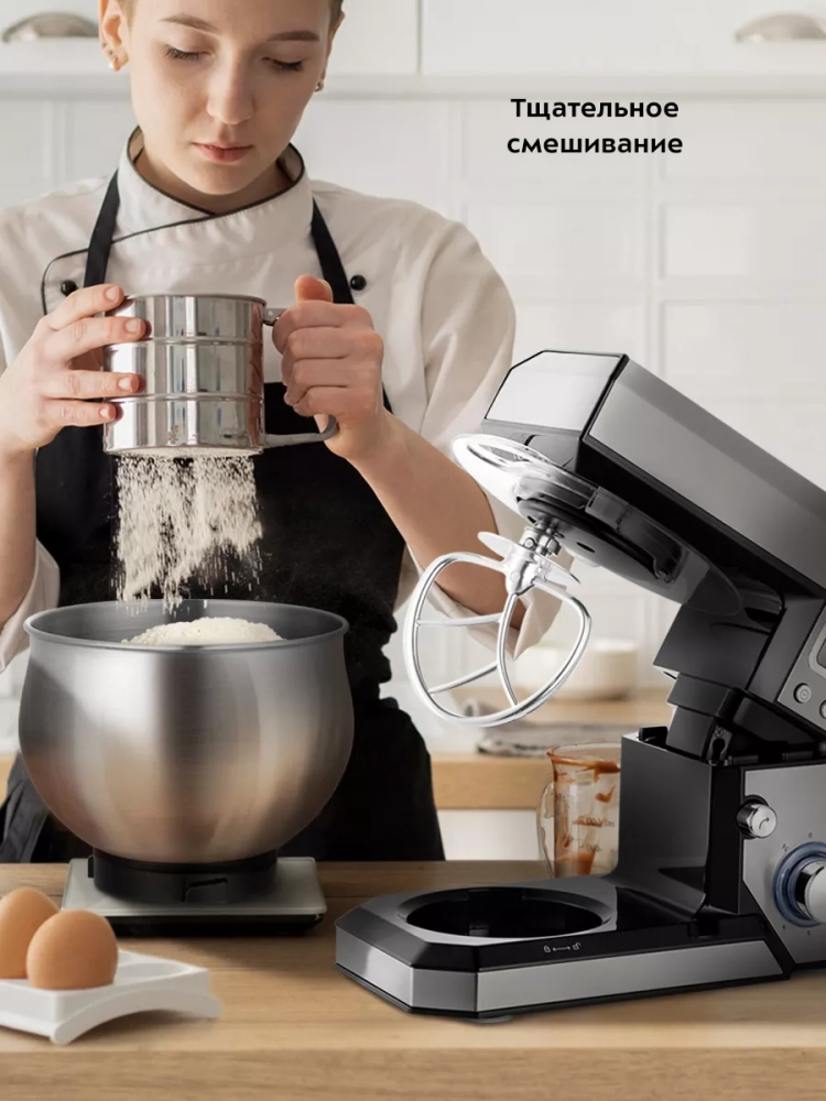 Миксер может работать в полностью автоматическом режиме. Вам достаточно только положить ингредиенты, надеть насадку и выбрать нужную скорость работы.