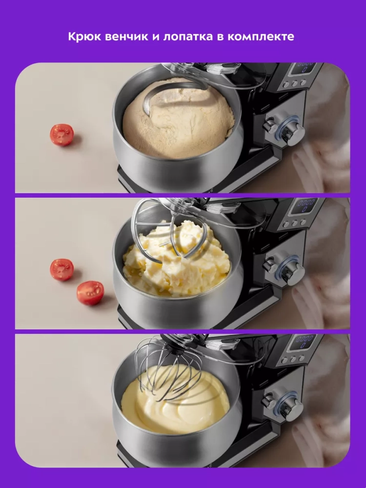 Венчик служит для взбивания яичных белков, сливок, замешивания жидкого теста. Насадка для смешивания используется для негустых ингредиентов, приготовления картофельного пюре, томатной пасты, кондитерских смесей или теста для тортов. Крюк для замешивания подойдет для замешивания густого теста.